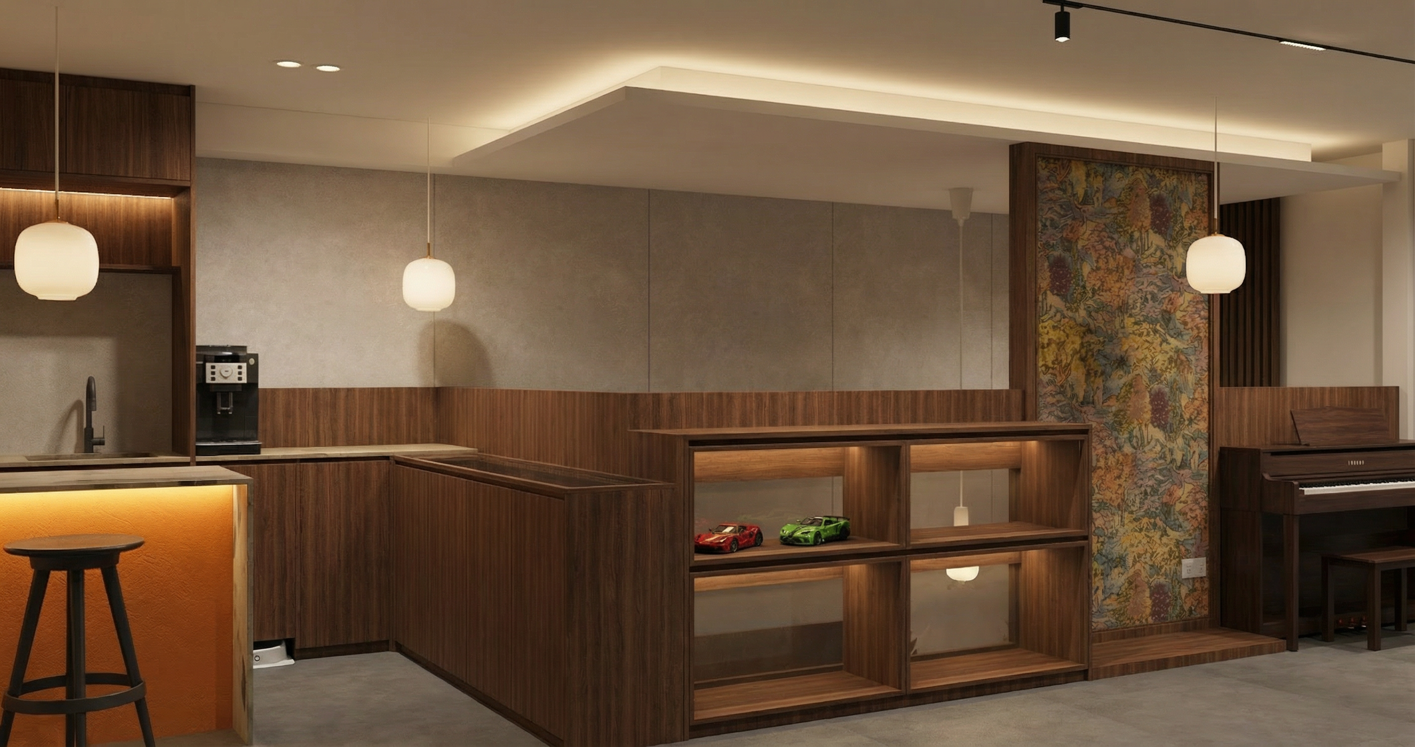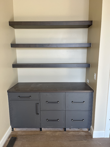 do not change the cabinets in any way preserve the exact cabinet colors materials finishes dimensions door and drawer styles hardware spacing alignment and all geometry exactly as shown do not alter the countertop shape backsplash appliances flooring lighting fixtures or wall structure only remove the construction materials clutter and mess from the scene clean the room and make it look finished and staged add a few simple tasteful home accessories appropriate for the style of the space but do not add or remove any furniture windows or architectural elements maintain the original lighting direction and realism enhance clarity and polish the photo while keeping the cabinetry and room design completely unchanged do not alter the lighting to keep the cabinet colors as they are in the image stage this as an industrial office with new flooring
