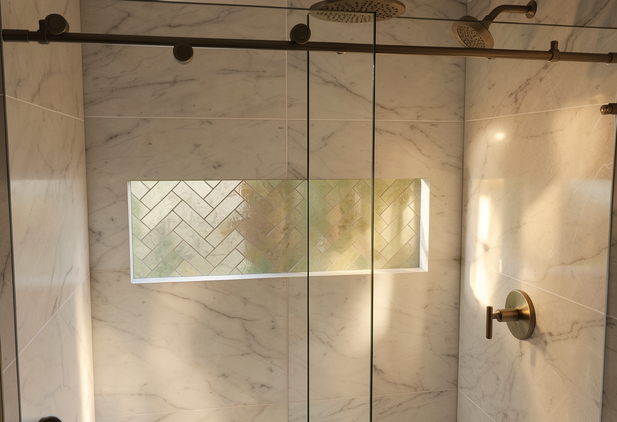 render a high end transitional bathroom from the moodboard featuring a slab of grey goose marble as the countertop and shower walls show any light fixtures as illuminated and add warm sunlight from nearby windows ensure there are several plants around the space and a companion wallpaper feature behind the vanity grey goose marble has a medium grey background with think dark grey veins