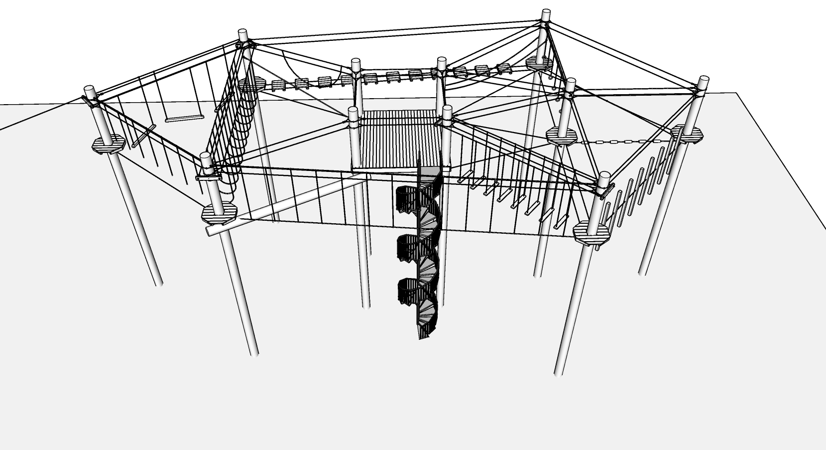 exterior shot a serene woodland adventure park featuring a ropes course with wooden platforms and bridges the large vertical poles are painted in a deep forest brown the horizontal beams and platforms are rich brown showcasing natural wood grain the ropes are a white suspended hanging elements in a muted color the atmosphere is peaceful and inviting with lush green green field and a few trees casting soft shadows on the course enhancing the feeling of an adventurous escape into nature put few people on the ground for scale architecture