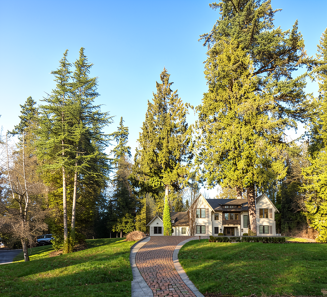 clean modern architectural exterior rendered in cinematic bright mid day lighting with vibrant blue skies and fluffy white clouds modern contemporary architectural style select grade horizontal cedar siding beautifully lush green manicured landscape around structure with hedges and gardens black standing seam metal roof prominent cinematic forest with big trees and lines of orchards in the background with mountains in the far distance high fidelity photorealistic visualization crisp shadow falloff refined facade geometry soft atmospheric depth premium architectural photography mood ultra clean composition and materials dark trim around windows angle from the ground looking up towards the structure slope the roof back to the back of the house