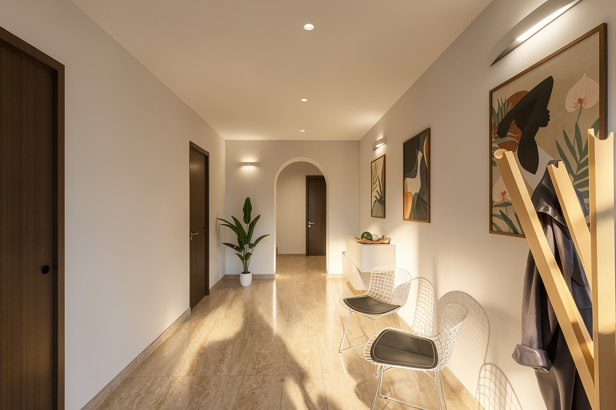 do not remove or change any geometry in image rough hewn tennessee fieldstone stained straight grain white oak tongue and groove ceiling dark metal window frames cold rolled steel beams blackened steel wall panels around kitchen range wall and above upper cabinets soapstone countertops and backsplash at range wall and shelving beyond dark stained walnut wall paneling above range dark stained walnut cabinetry above cabinets light coming from linear pendant above island smooth finished stucco walls sparse native plants outside afternoon light with shafts of light coming from windows on left side of kitchen add square can lights to ceiling no hardscape visible through windows