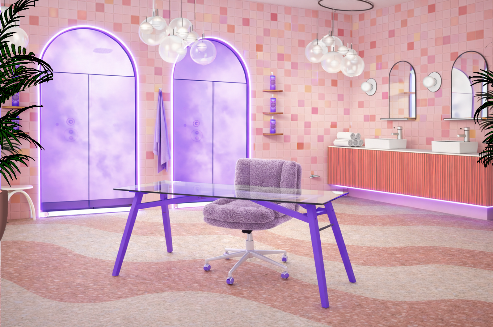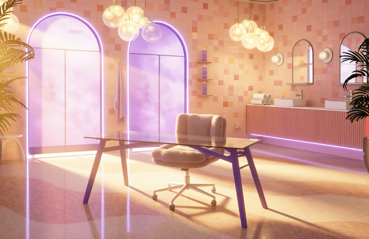 can you please take the image and remove all sunlight beams and directional sun effects light the scene with a large soft front facing studio key light positioned at the camera like a beauty product shoot shadows should fall behind objects toward the back wall not toward the camera keep the shower arches glowing purple as self illuminated elements lighting should feel flat bright and even no dramatic rays no side light