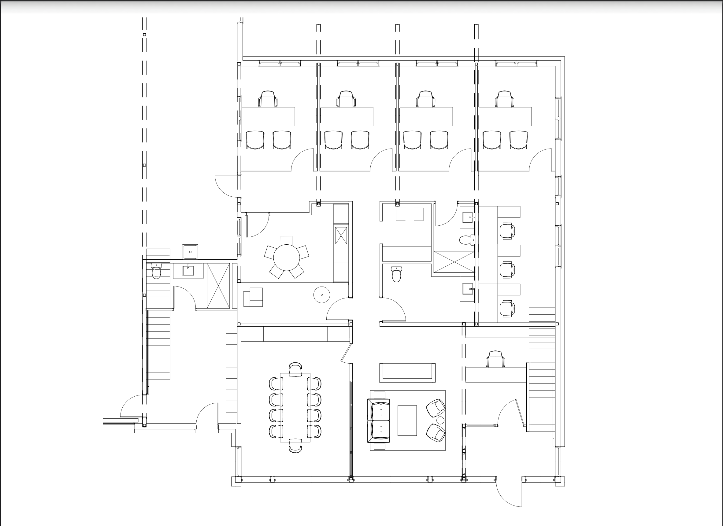 convert this floor plan into a realistic isometric 3d view of a full house show the space from an elevated angle with furniture walls and details visible modern style furniture wood accents lots of cabinetry in each office space use the same furniture as shows on the plan do not change the orientation of the floorplan