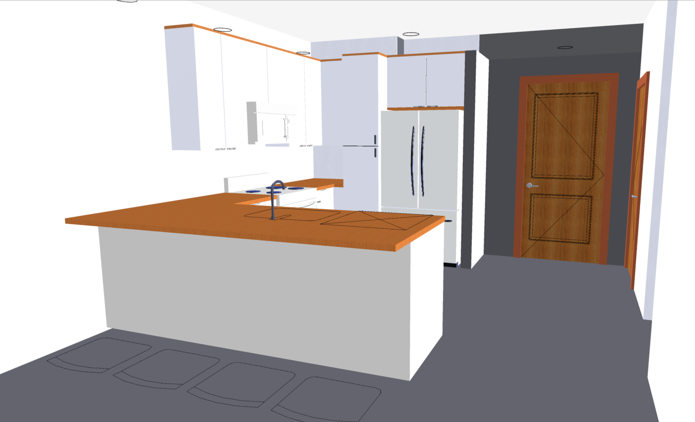 render this kitchen with light oak cabinets cabinet handles to be brass brass sink faucet quartz countertop with very slight grey vein quartz backsplash with very slight grey vein appliances to be ge caf model in matte white refrigerator handles to be brass range handle to be brass microwave handle to be brass flooring to light oak walls to be painted flat white base molding to be painted glossy white entry door to the right to be a flush panel door painted white