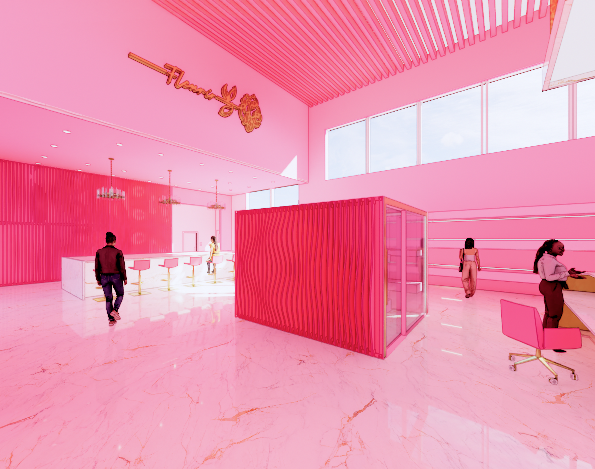 the photo is realistic and the people materials and textures are realistic quality the floor is a white marble with gold veining the wave texture on the display case is a bright hot pink the walls are a lighter hot pink there are 3 longer shelves on the back wall with led lighting under them to show off the product the shelves should have small clear vases of all different kinds of flower stems placed on the shelving each vase should have a different bundle of flowers in them there is a gold sign hanging above the wall the windows should have a view of clouds and buildings in the back there is a bright hot pink wavy texture with 3 gold chandeliers hanging above the white marble with gold veining counter the ceiling is a bright hot pink slats with bright led lights in between each one lighting should be bright showing the daylight and still highlighting the product the feeling is luxury
