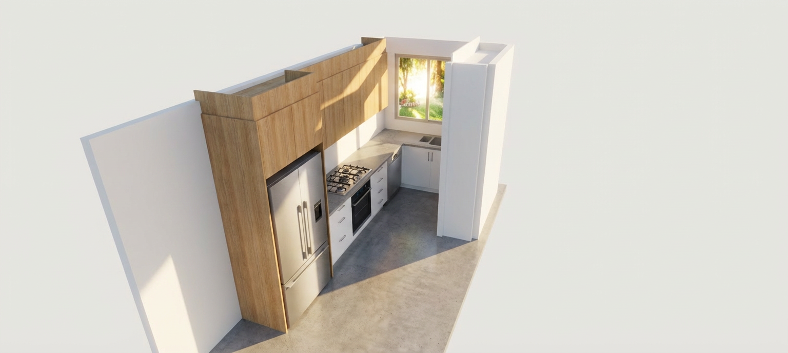 do not change the structure or layout of this kitchen create a doorway centered on the back wall directly aligned with the kitchen viewpoint the opening should lead into a walk through pantry inside the pantry add cabinetry and countertops on both the left and right sides forming a galley style layout at the far end of the pantry place a window that is visible from the kitchen through the doorway ensure they doorway pantry and window are perfectly aligned on a straight axis match the existing flooring lighting and perspective for a seamless realistic integration