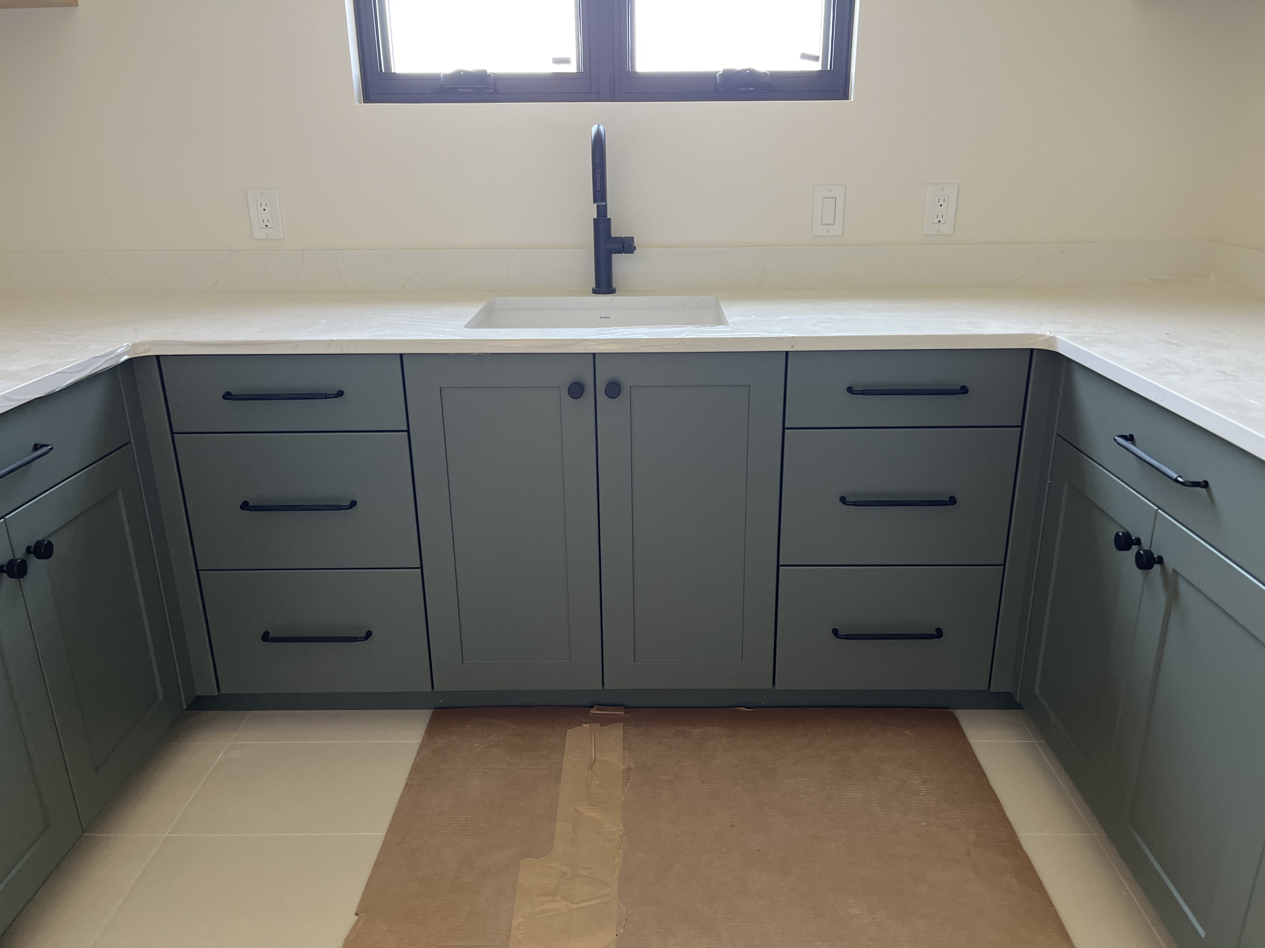 do not change the cabinets in any way preserve the exact cabinet colors materials finishes dimensions door and drawer styles hardware spacing alignment and all geometry exactly as shown do not alter the countertop shape backsplash appliances flooring lighting fixtures or wall structure only remove the construction materials clutter and mess from the scene clean the room and make it look finished and staged add a few simple tasteful home accessories appropriate for the style of the space but do not add or remove any furniture windows or architectural elements maintain the original lighting direction and realism enhance clarity and polish the photo while keeping the cabinetry and room design completely unchanged do not alter the lighting to keep the cabinet colors as they are in the image re stage for a butler s pantry put a nice view in the window do not change the cabinet color at all keep the picture angle as is