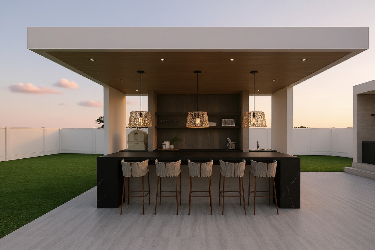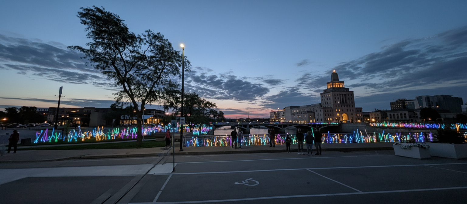 make a dark evening scene on the left side in the lawn areas add a light sculpture like sensorio in paso robles along the sidewalk between the lawn spaces add people