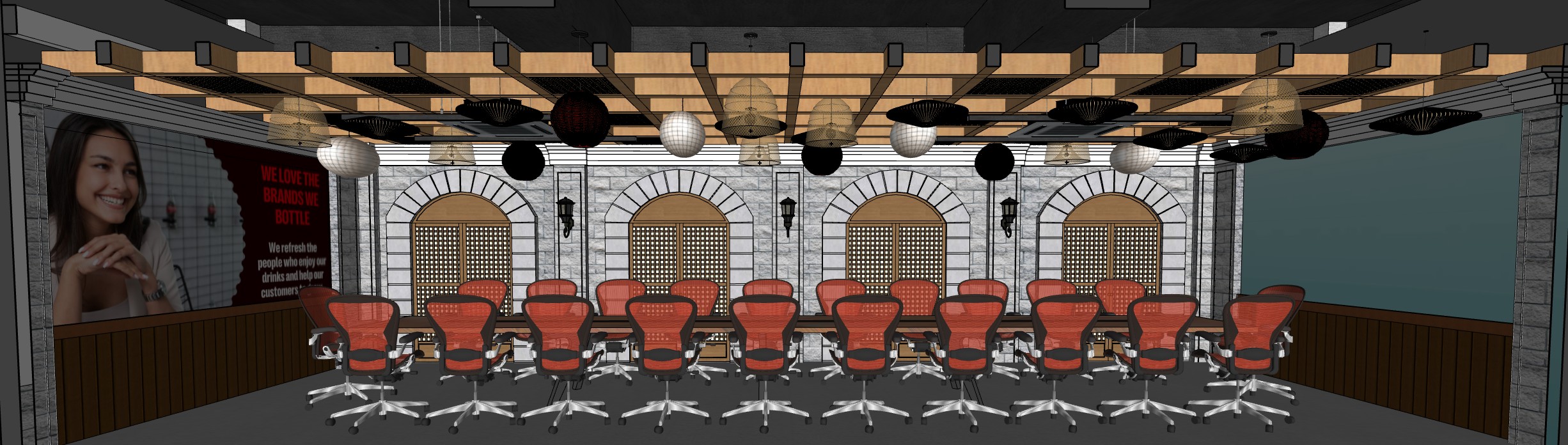 render a modern and elegant conference room inspired by the walled city of intramuros manila use natural materials and colors the walls should be textured gray stone contrasting with wooden accents that have a natural oak finish the ceiling features wood beams in a soft beige incorporate a row of striking red ergonomic chairs surrounding a modern mahogany conference table add stylish contemporary rattan and capiz pendant lights in natural wood red and neutrals hanging above large capiz faux windows allow soft natural light inon one side feature an led wall displaying branding materials the overall atmosphere should be professional yet comfortable fostering creativity and collaboration