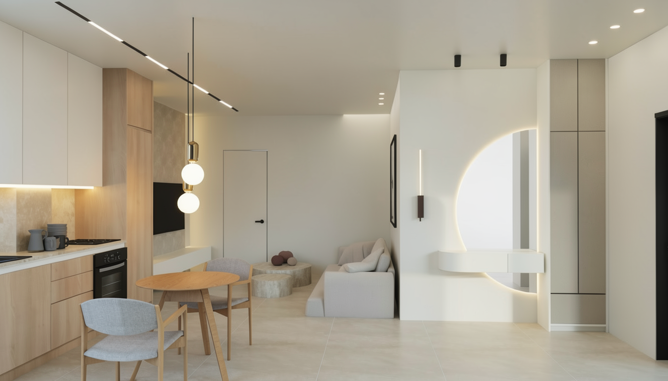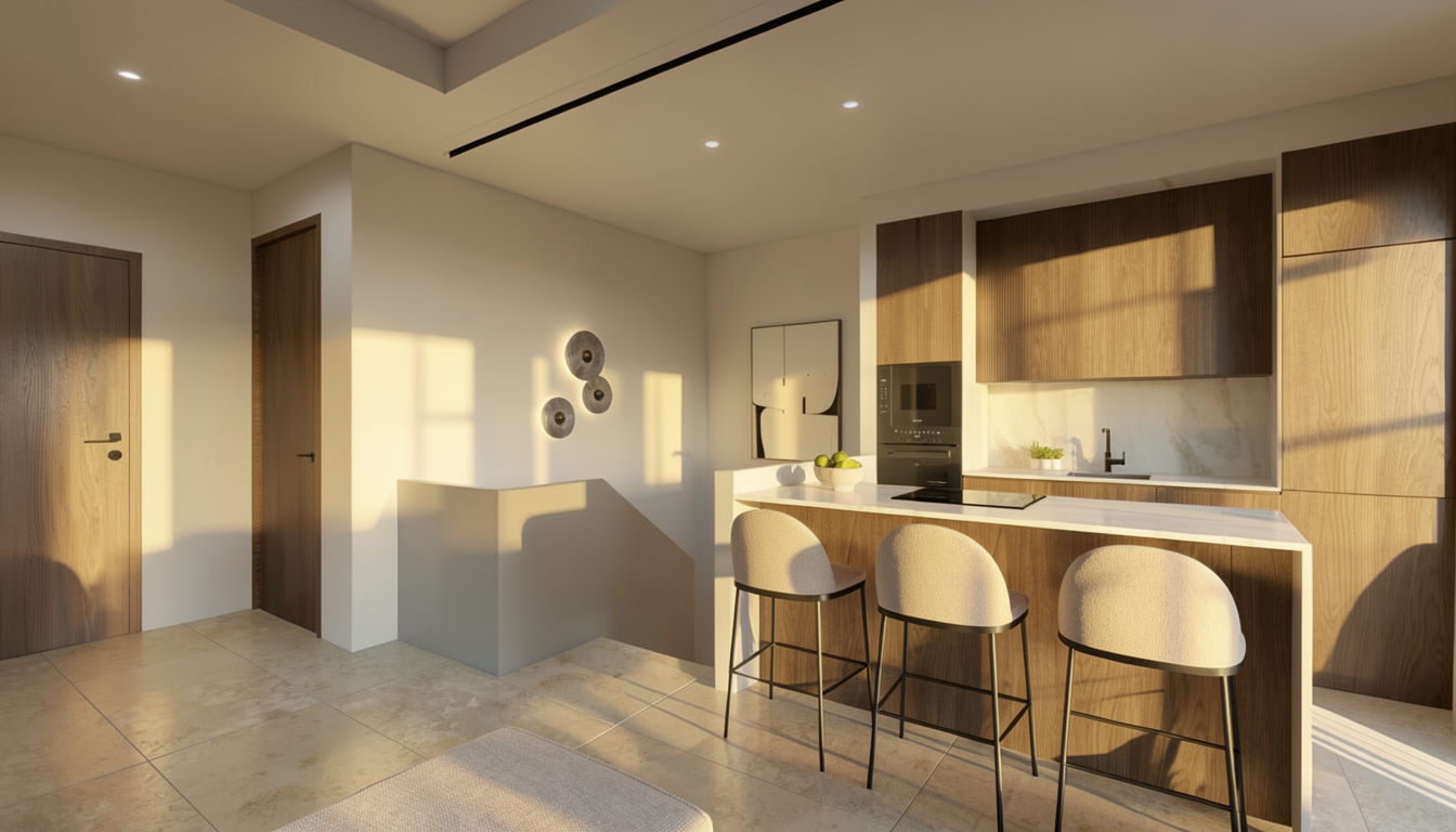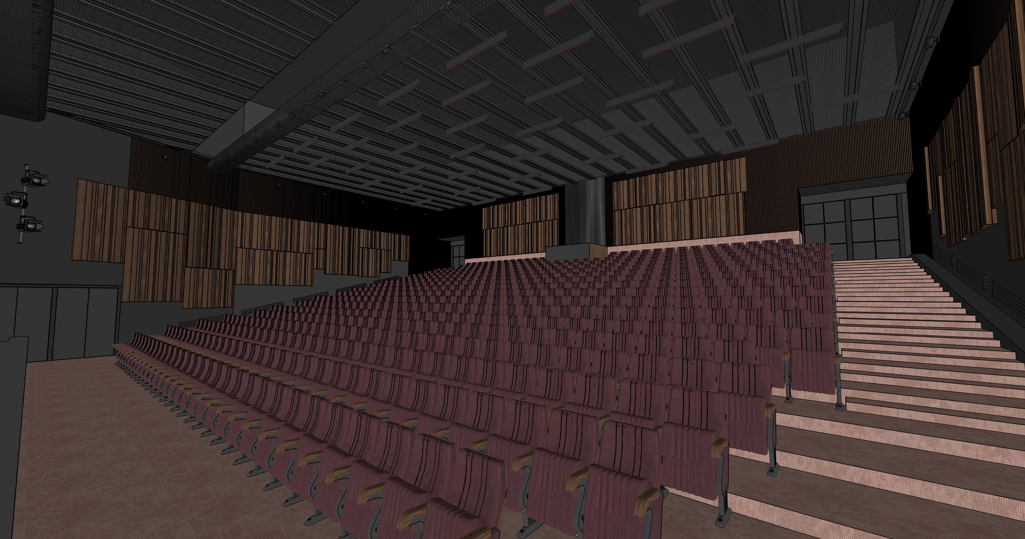 transform the provided theatre interior image into a high end photorealistic render while keeping exactly the same proportions do not move or alter any objects geometry textures or furniture positions the chairs materials are olive green colour should read realistically the black wall is from acustic panels from reciclated materials carpet on the floor beige colour carpet on stairs carpet on front of stage gray black vinyl on stage wooden panels raw light oak wood with carved lines a vertical led light is hidden vertically in the slanted panels top strip made of thin wooden slats black curtain violin player on stage a grand auditorium with elegant wooden panels and rows of plush seats in rich oak wood the stage is adorned with a luxurious deep velvet curtain in black reflecting a soft warm light the ceiling features modern black sleek designs with muted matte black accents ambient lighting casts a warm inviting glow creating a sophisticated and serene atmosphere