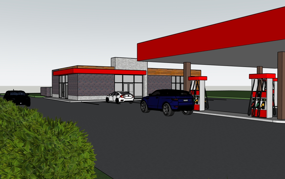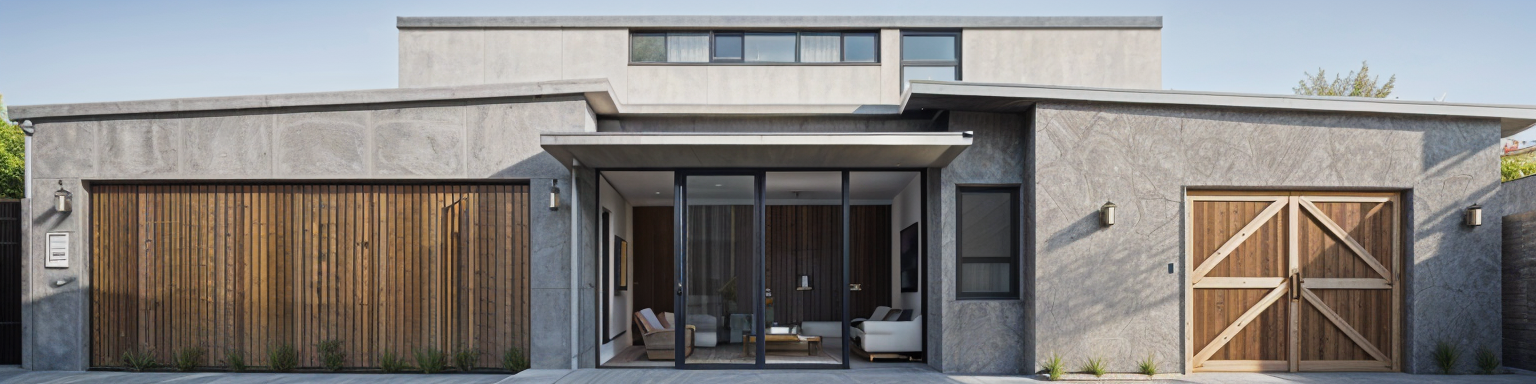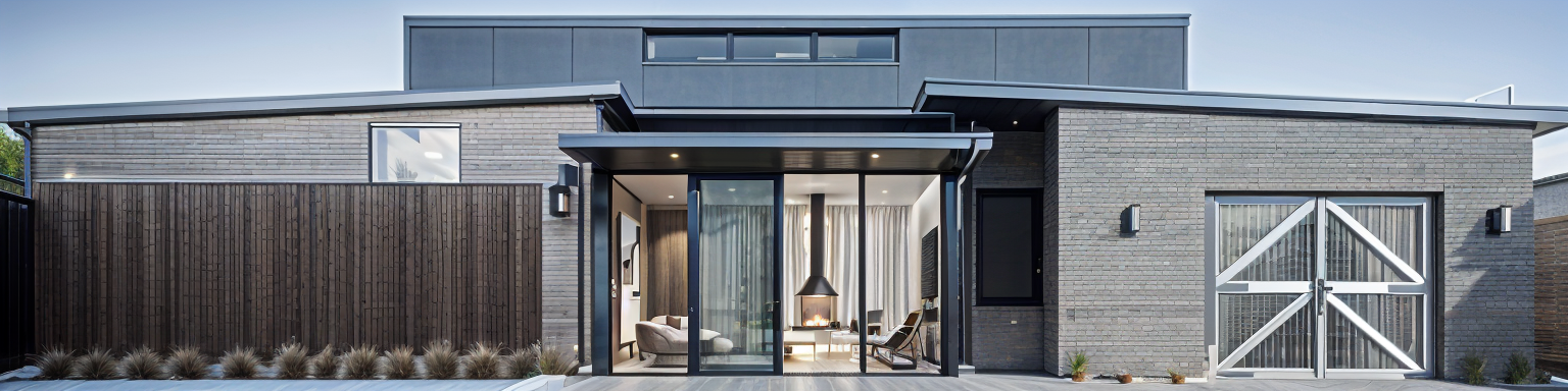 minimalism exterior shot provide rendering with red stripe brick and stone cladding with wood parapet add cloudy sky architecture