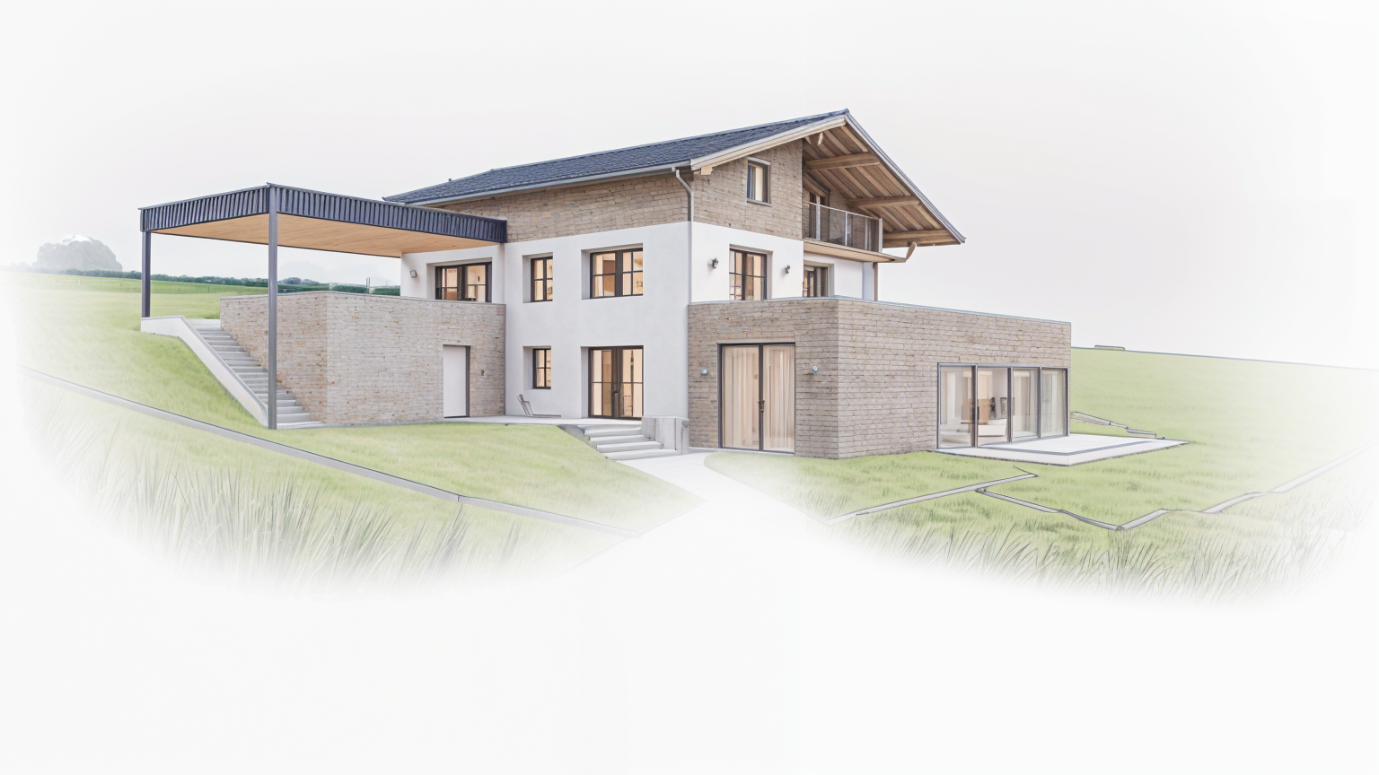 this is modern a frame cabin the brick part is fireplace and materials are stone and wood and metal render mi image in the woods