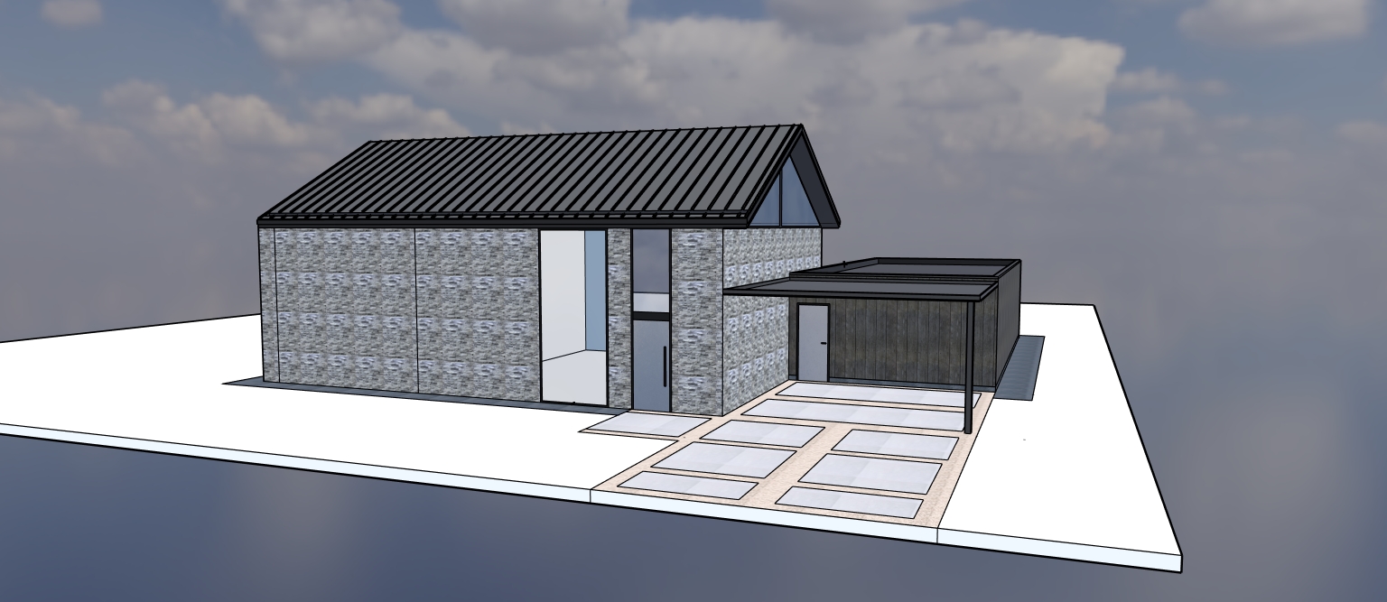 modernist exterior shot a nice lawn around the house a natural grey stone wall with a nice paved concrete slabs an open carport mountain in the background with trees architecture
