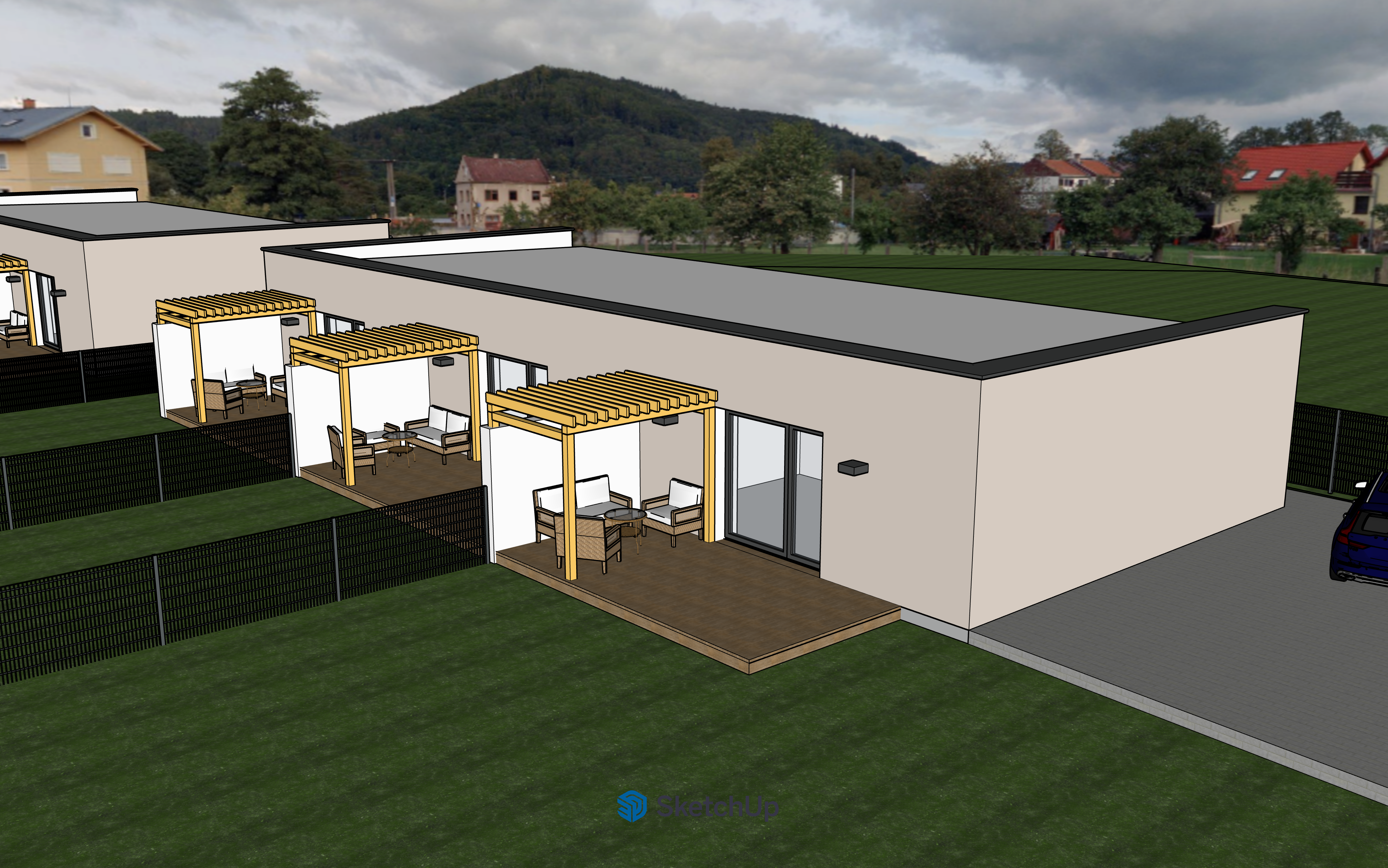 exterior shot vykresli realisticky d m s e t emi byty a terasami kter jsou dd leny st nou na kterou navazuje pergola