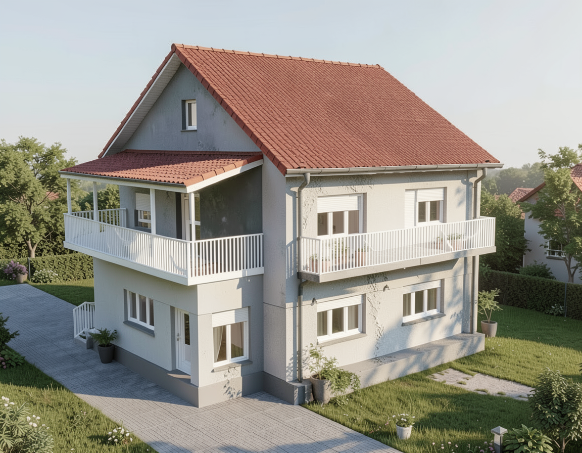 add a forest background with clean cut lawn and maintain all finishes siding locations do not change windows and doors and massing of the image provided railing should be glass panel facia and down spouts to be black