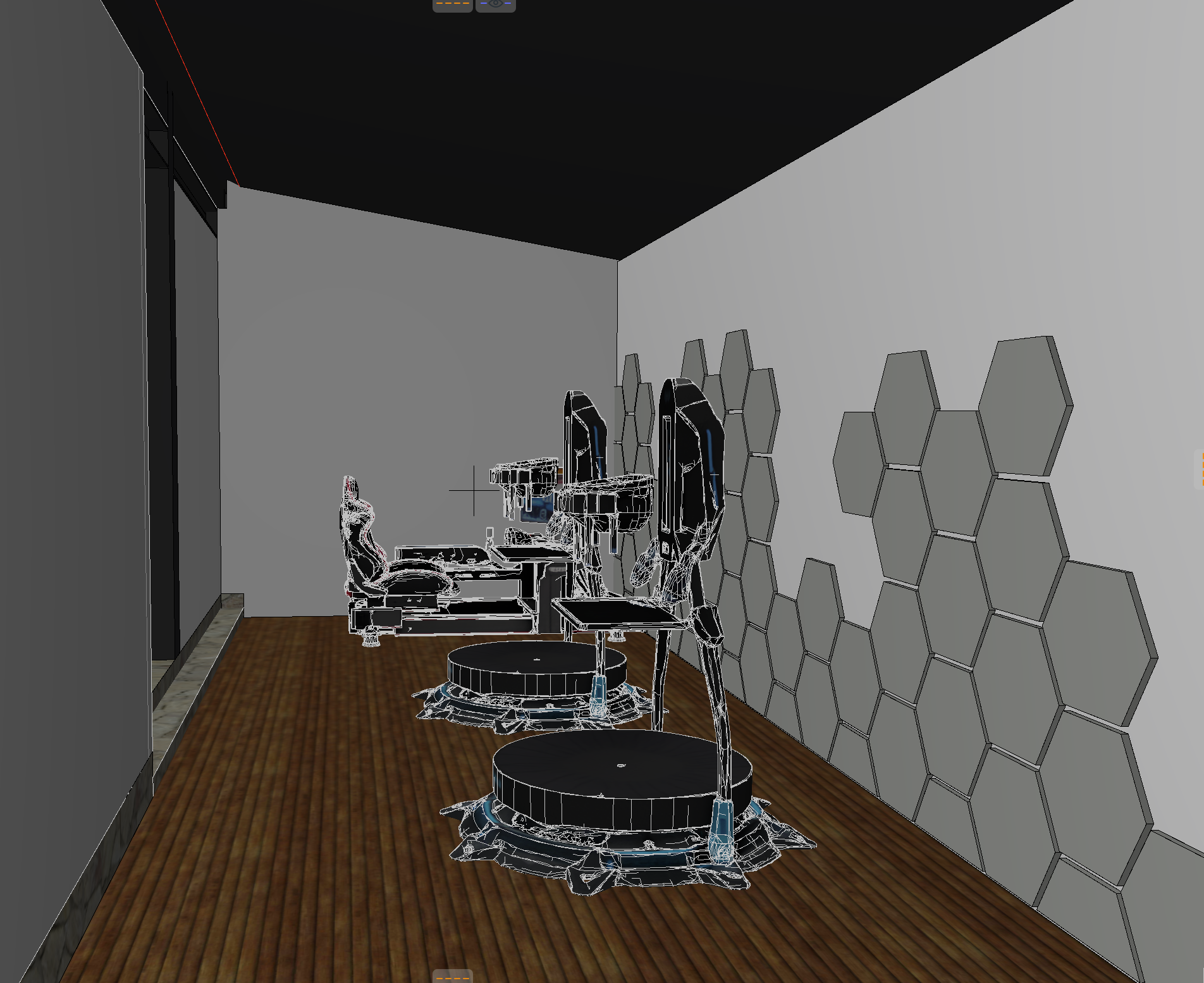 transform this internal view into a realistic render the image shows a gaming room with feature hexagon side panelling with back lighting you can also add elements that will make the design seem more high tech simulation gaming room