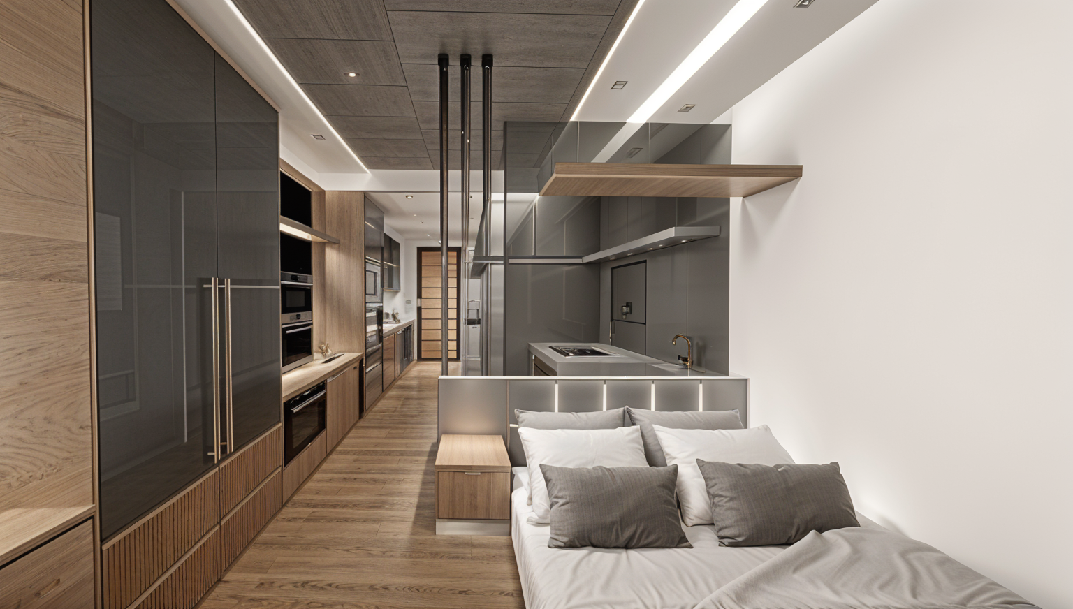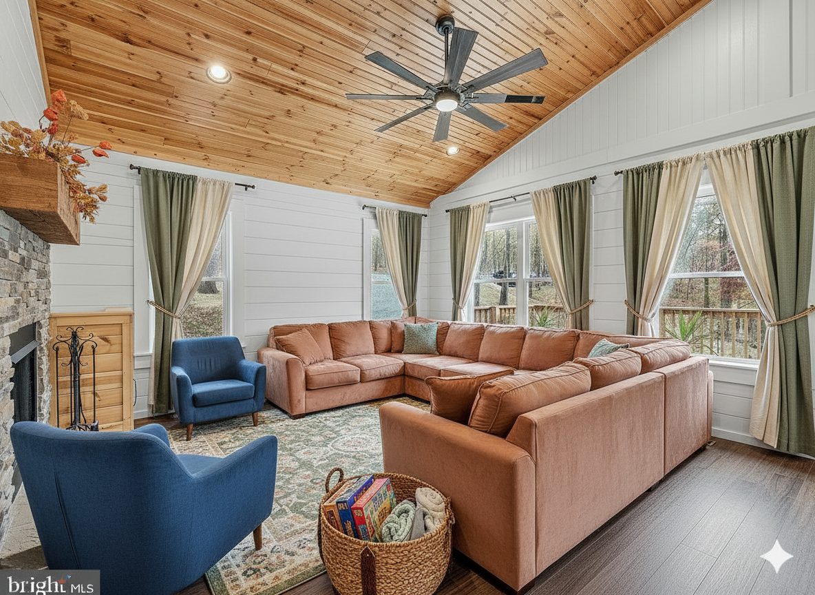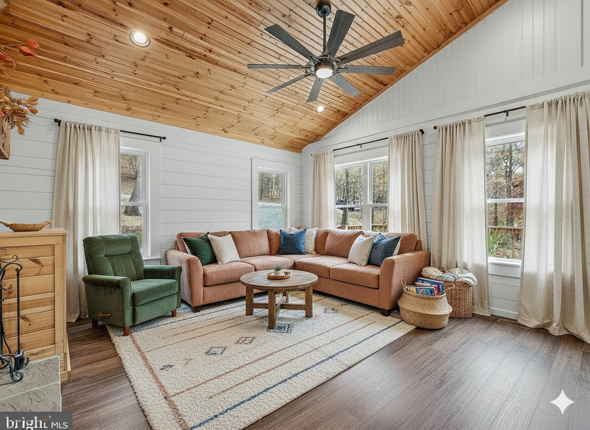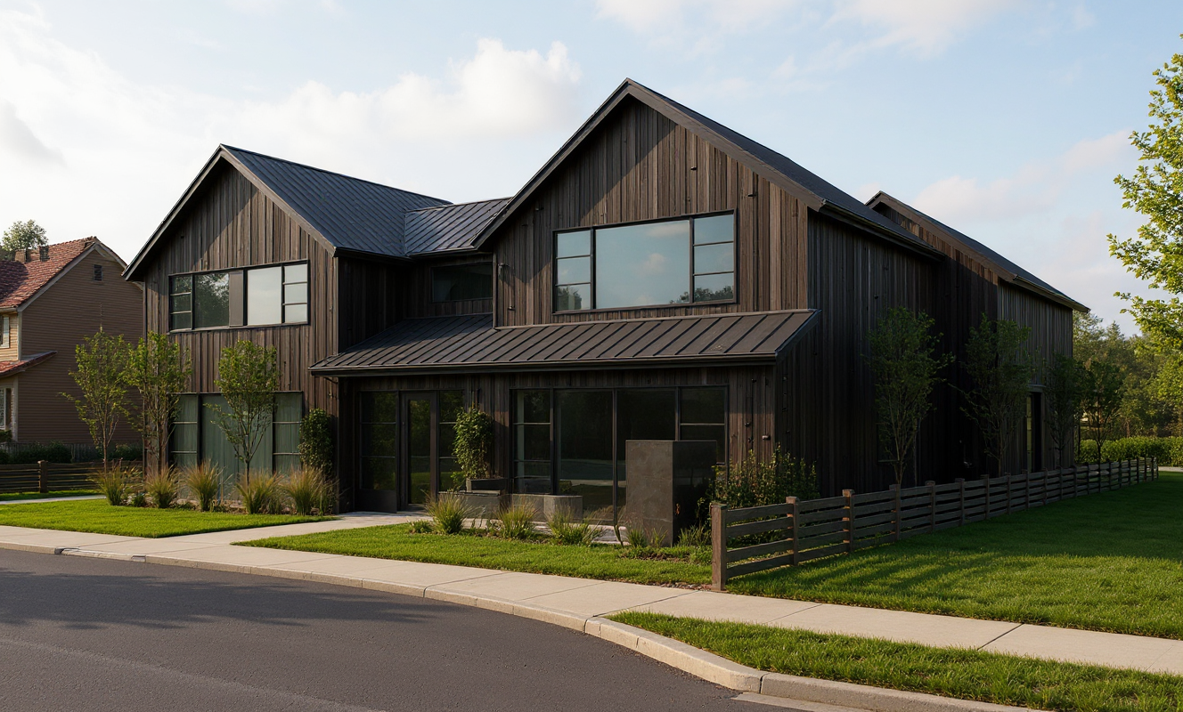 create a outside elevtion view with this floorplans using black siding and black stand ans seam metal roof