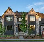 exterior shot classic transitional house on a green lawn surrounded by lush greenery and tall trees the house has a traditional design with large glass windows and dark stone walls the roof is flat and extends over a spacious balcony with a black metal railing the sky is vibrant blue with fluffy white clouds creating a serene and inviting atmosphere the scene should be rendered with natural lighting to emphasize the modern elegance of the design