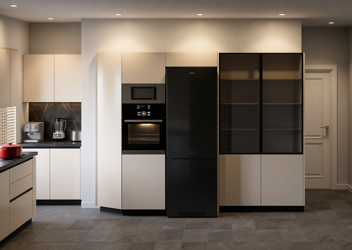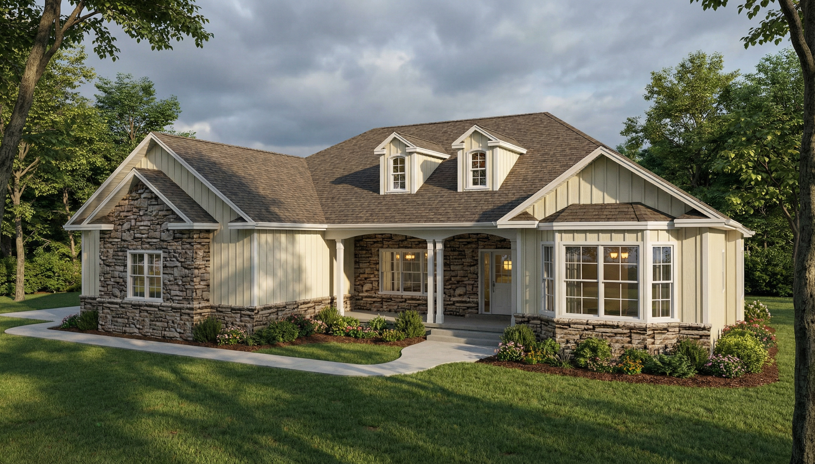 render a charming modern house inspired by the provided blueprint the house should feature a contemporary design with horizontal siding painted in a soft cream color the roof should be a sleek metal in a muted silver tone highlight the windows with black frames and add wooden accents around them the front door should be a bold navy blue the atmosphere should be calm and inviting with a golden sunset casting warm shadows include surrounding greenery with lush emerald grass and a few tall trees in the background