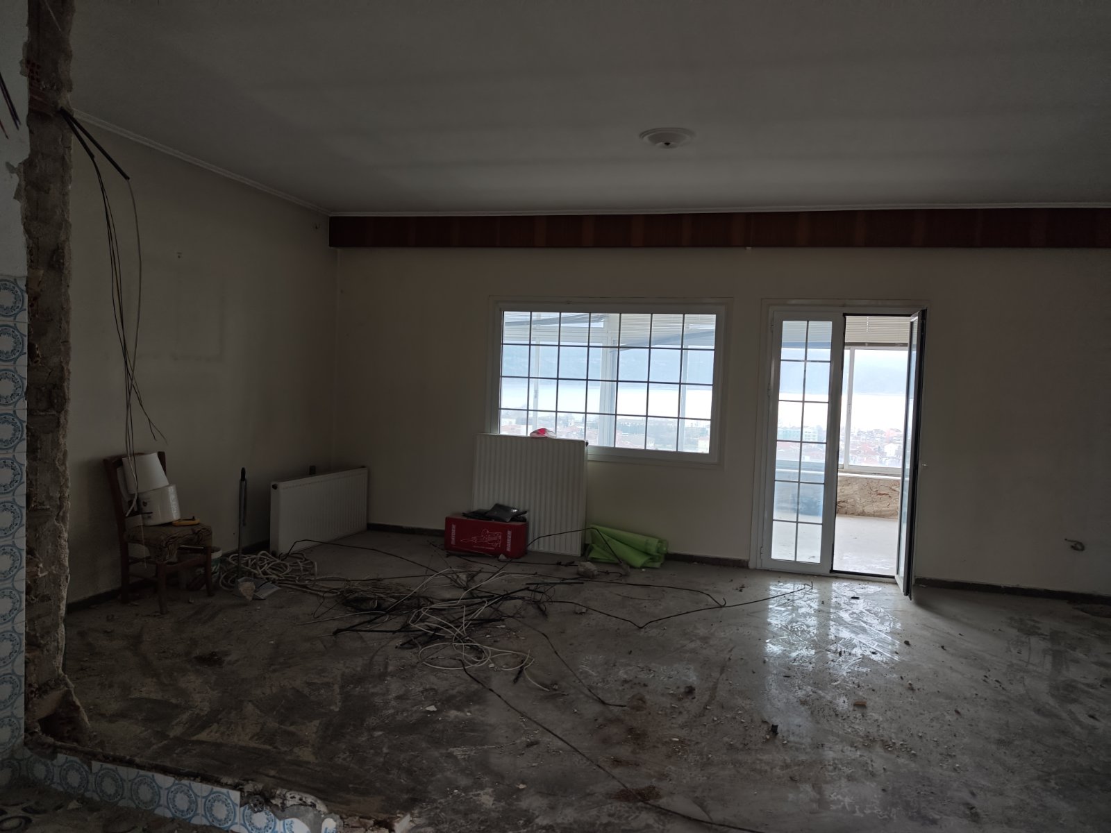 a beautifully renovated living room with a contemporary design featuring light cream walls and a smooth polished wooden floor the ceiling is painted in a soft white with elegant crown molding large windows with sheer curtains allow natural light to flood the space creating a warm inviting atmosphere vibrant green plants in decorative pots are placed strategically to add a touch of nature the walls are adorned with modern art pieces in subtle pastel colors the room feels airy and open exuding a sense of tranquility and modern elegance