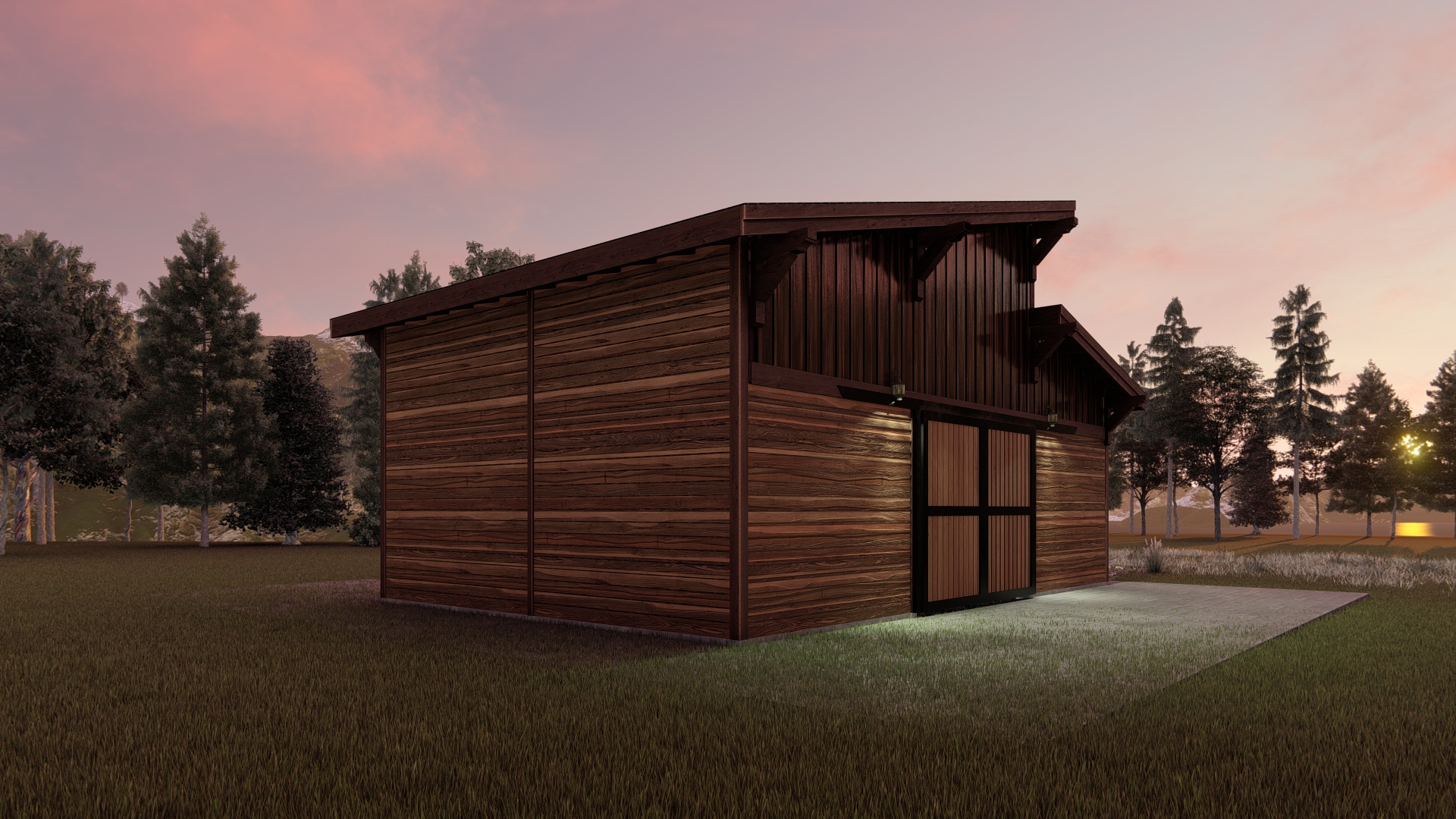 clean architectural exterior rendered in cinematic daylight lighting warm cedar siding on the bottom portion of the structure cedar wood barn doors with black trim black metal standing seam roof forrest in the background soft daylight landscape with blue skies glass reflections on the windows natural wood textures high fidelity photorealistic visualization crisp shadow falloff refined fa ade geometry richly detailed grain patterns soft atmospheric depth calm minimal landscaping premium architectural photography mood ultra clean composition and materials