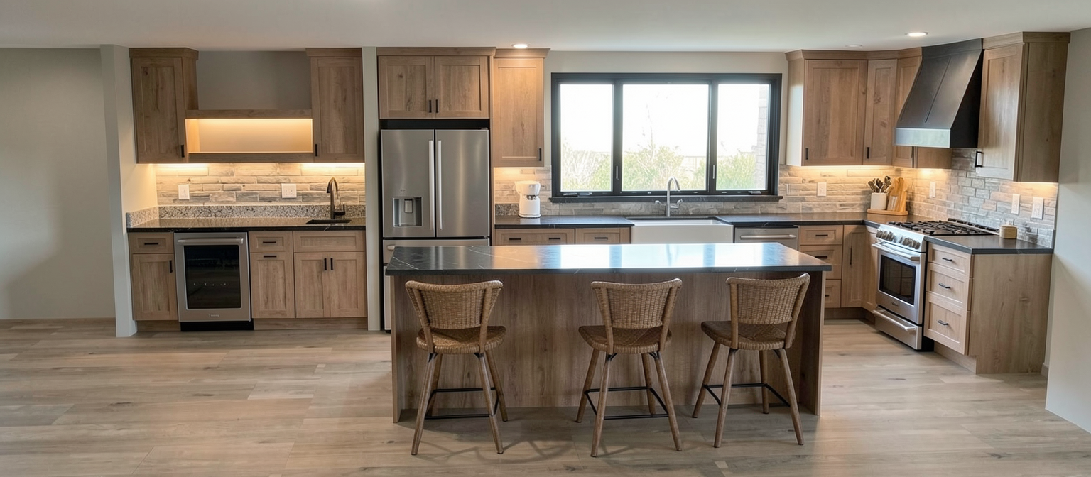 modern rustic kitchen with farm sink and mediumd colored cabinets add under cabinet lighting add modern chairs to the island add dark rustic stone to backsplash