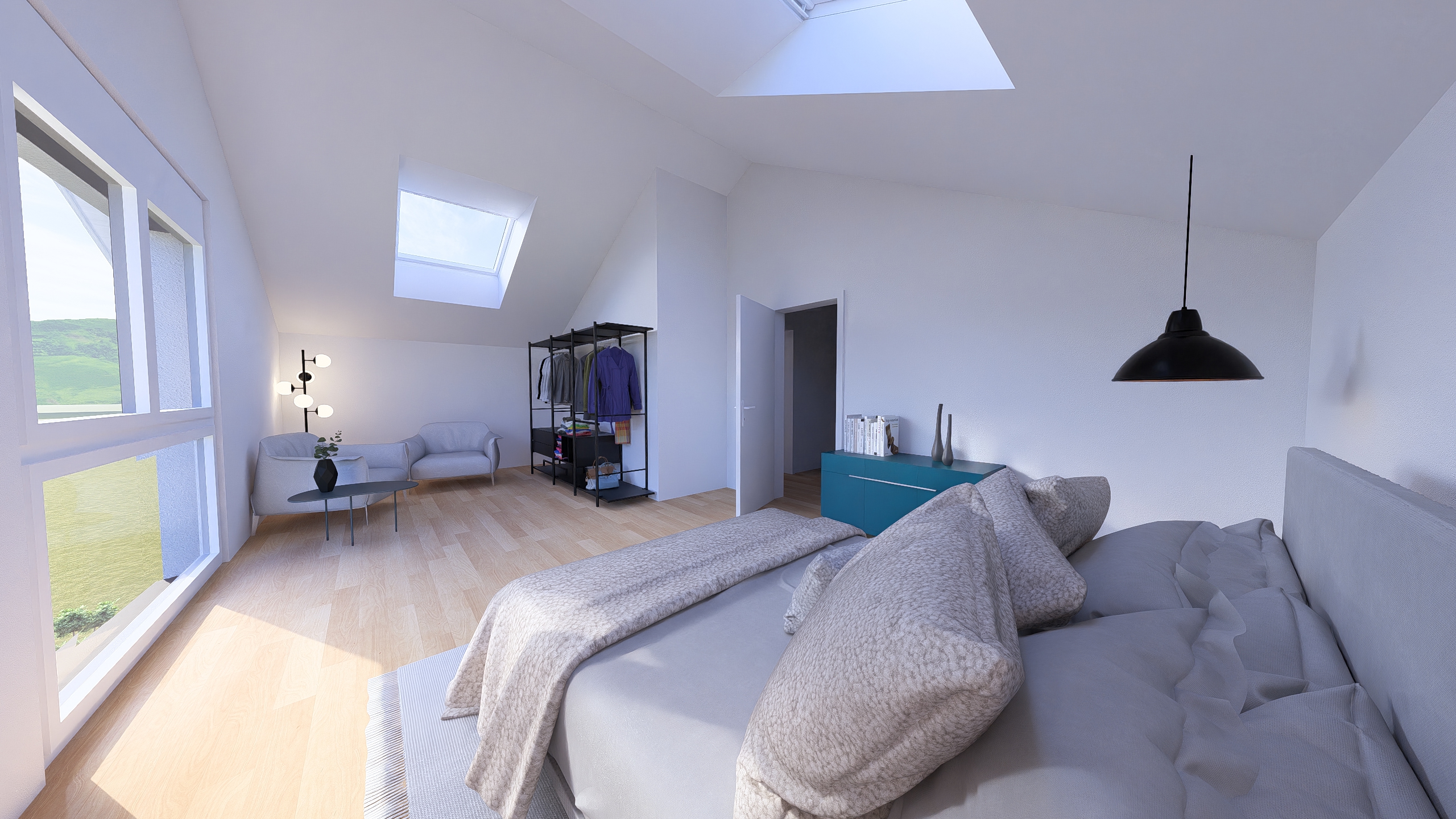 a modern and luxury sleepingrrom room with bright daylight in font of the window there are curtains