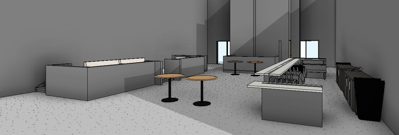 modernist exterior shot create a modern inviting caf interior with sleek minimalist design the walls should be a soothing dove gray accented with a subtle texture the flooring is polished concrete with a light speckle pattern offering a contemporary feel use warm cozy lighting that softly illuminates the space the counter areas should be a cool slate gray with glossy white countertops the tables are a rich maple wood with black metal bases for contrast windows provide soft natural light enhancing the relaxing ambiance add sleek bar stools with a matching maple seat and black frame ensure the atmosphere is welcoming and tranquil perfect for a cozy morning coffee architecture