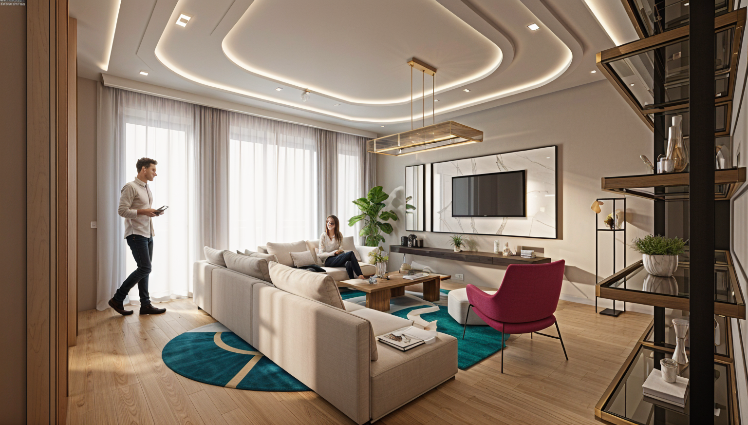 modernist interior shot a hyperrealistic interior scene of a modern luxury living room in daylight the layout and proportions must follow the reference apartment exactly the ceiling has soft sculptural curves with integrated led strips along the edges built in spotlights and a large modern ceiling light fixture above the main seating area include floor and table lamps placed naturally in corners or beside furniture a family or a couple can be present sitting reading walking in or talking but naturally integrated into the scene no posing key materials light oak or walnut floors boucle or linen sofa stone or wood coffee table brass or black metal accents scene includes cushions slightly misaligned a glass of water open book or remote control natural light coming through sheer curtains soft shadows bounce light on walls one or two indoor plants subtly placed everything must feel real and balanced as if photographed in a real apartment no cgi effect camera depth and realistic lighting required modern italian style minimalism in details lighting etc add leather to sofa architecture