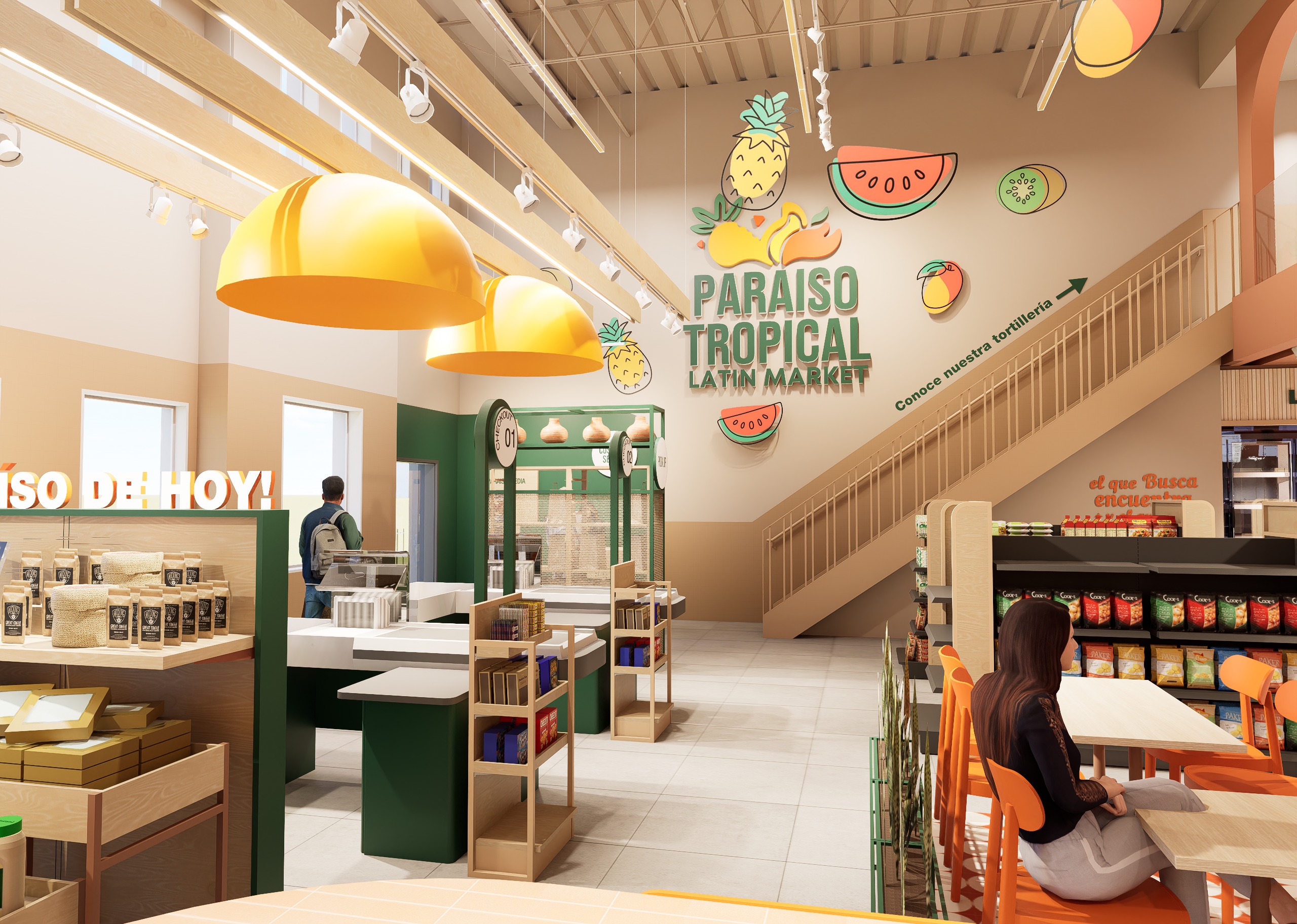 enhance the existing architectural scene by adding staff members only people additions one employee standing at each checkout counter two total wearing a green work apron positioned naturally behind the registers neutral professional posture everyday retail behavior not posing for the camera realistic human scale correct perspective soft contact shadows preserve all existing architecture furniture layout materials textures colors lighting and signage exactly as in the base image photorealistic integration clean and organized checkout area architectural visualization quality no customers added no additional people beyond the two employees no new objects products furniture or props no changes to lighting materials colors or geometry no stylization no illustration no cinematic effects simple solid green apron no logos no patterns