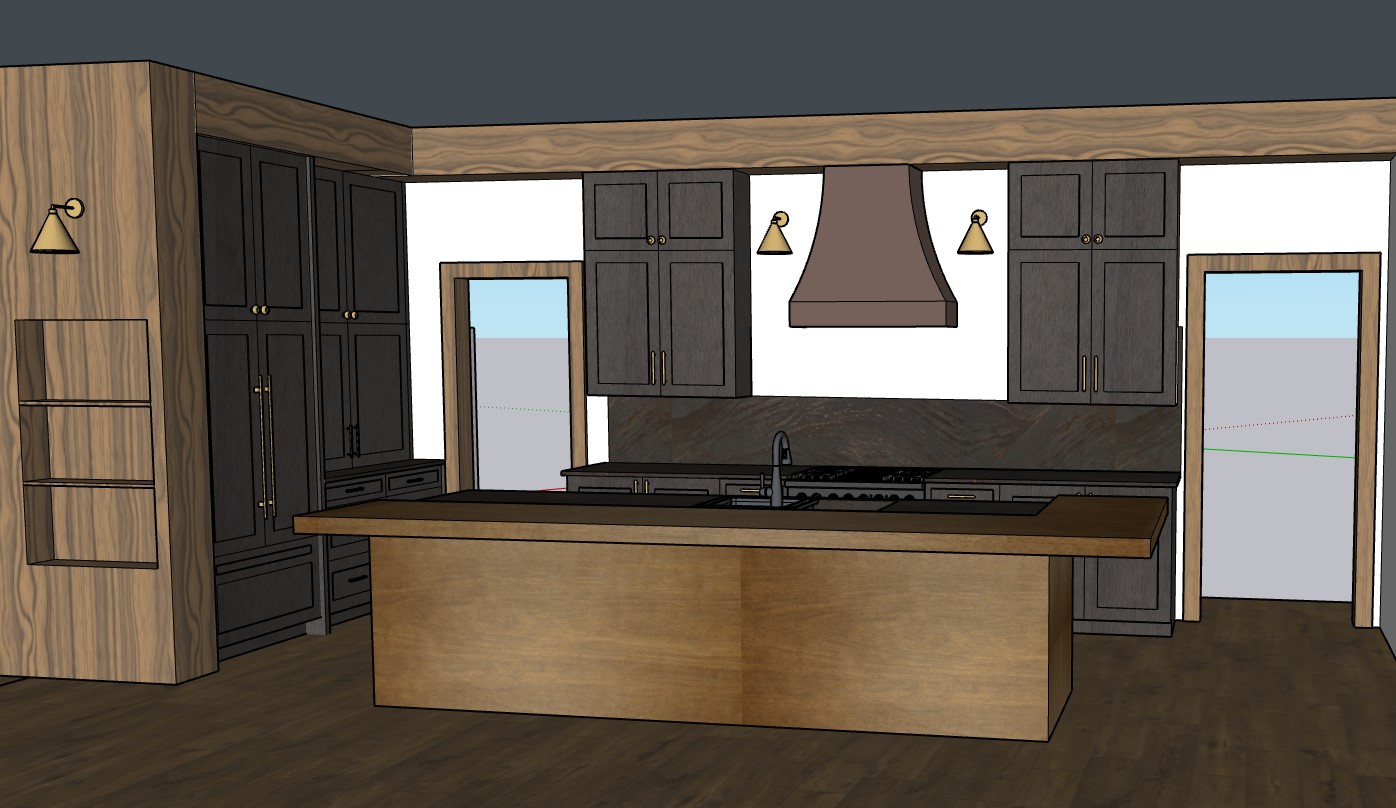 photorealistic render of a custom kitchen interior maintain original design and colors exactly do not alter color palette perimeter cabinetry is dark stained wood almost black with visible natural wood grain and a soft satin finish not painted not flat cabinet hardware is brushed brass handles and knobs kitchen island is a warm medium caramel stained wood with visible grain and a satin finish island and perimeter countertops match exactly in material and color range hood is brushed antique copper with a soft aged patina not polished not shiny wall sconces on either side of the hood are brass with a warm brushed finish lighting is warm 2700k 3000k a continuous wood soffit architectural band runs along the top of the cabinetry in an antique wood tone with subtle aging doorways are pocket doors with trim that matches the surrounding wood tones use realistic natural lighting soft shadows and accurate material reflections emphasize wood grain texture and depth and subtle metal reflectivity avoid overexposure avoid high gloss finishes and do not change or reinterpret any colors