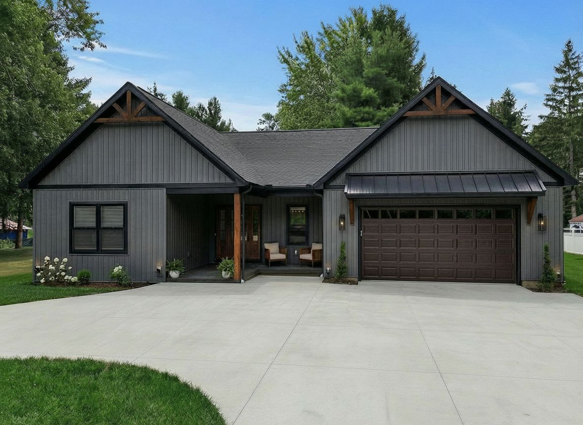 without changing anything else please recolor the single pillar in front of the entrance to exactly match the color and texture of the garage door