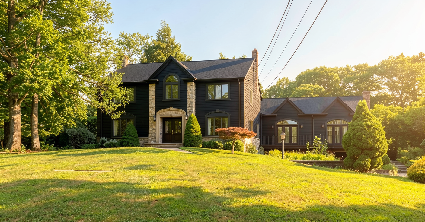 render a picturesque scene of a stately two story home with a charming country style the house is a light color horizontal siding and stucco accents with full height and width dark stone at entry pop out and elegant black roofs surround the home with lush vibrant green grass and tall majestic trees with rich green foliage the sky is clear and bright casting a soft golden light capturing the essence of a serene sunny day the atmosphere is peaceful and inviting with a sense of natural beauty and tranquility and natural stone at exterior wall base remove corner stone dark wood window frame