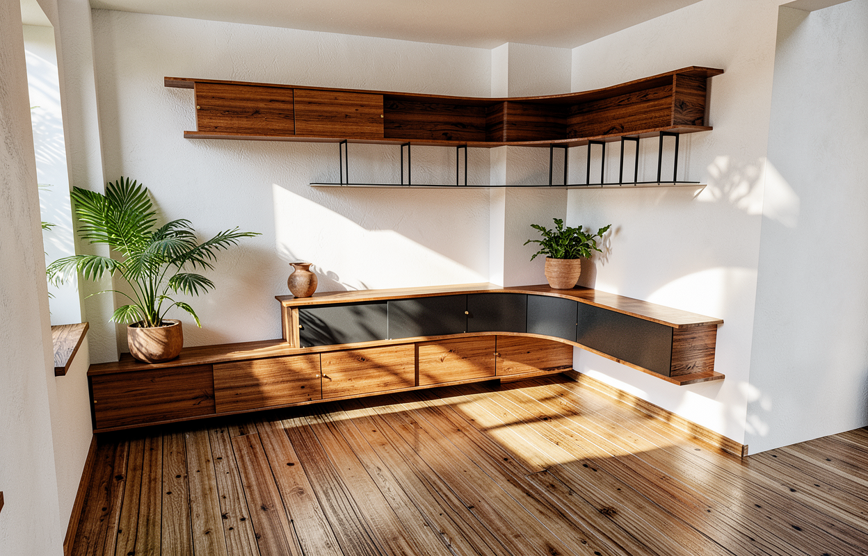 make a photo realistic view of this ash furniture add a tv screen on it some books inside