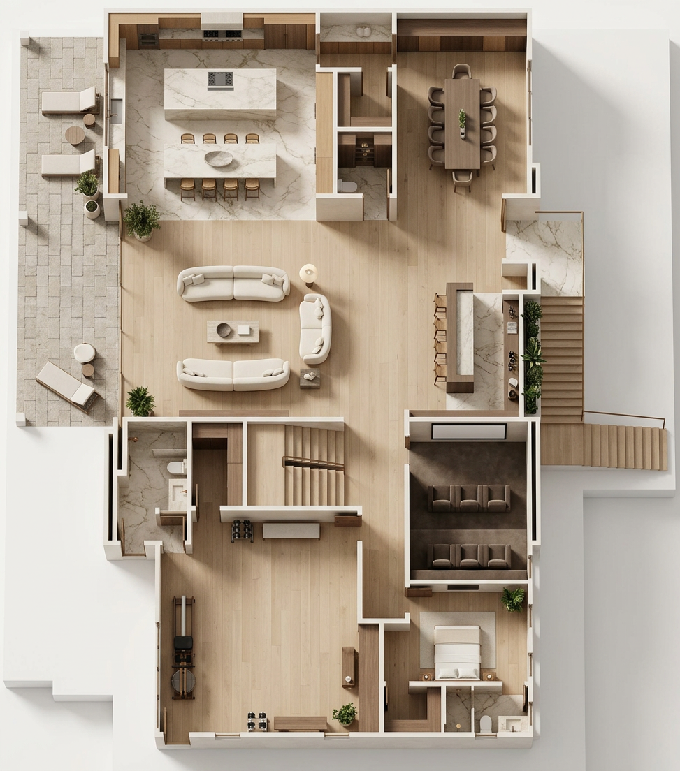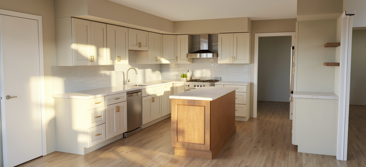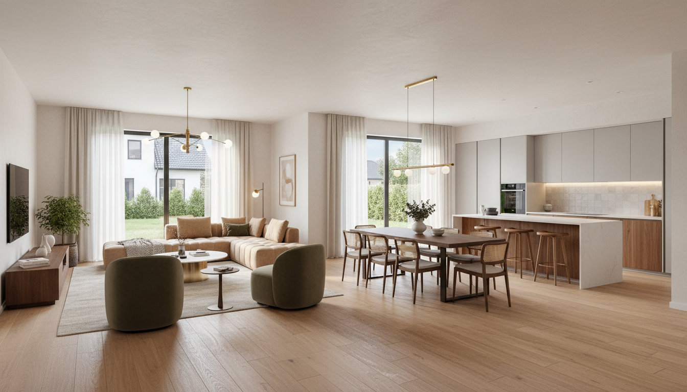 contemporary tropical residential complex identical to the reference image preserving composition perspective proportions and architecture do not change original colors or materials modern low rise buildings with balconies and lush tropical vegetation including plants integrated into balconies include only a street in the foreground with clean pavement and no buildings on the sides sunset golden hour lighting with warm tones soft shadows ambient exterior lighting and subtle interior glow ultra realistic architectural render 4k cinematic composition no people vegetation on the rigth side