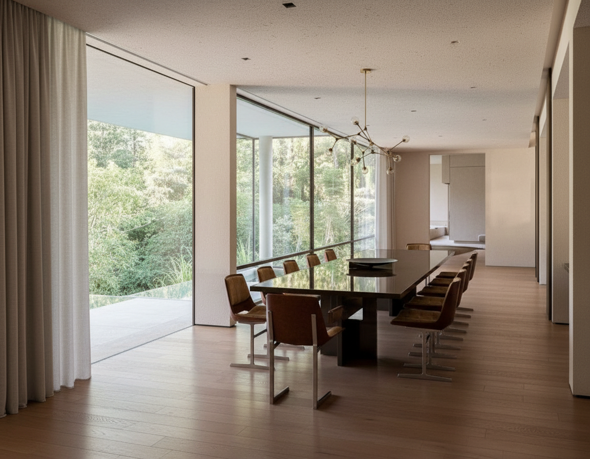 3d perspective of this house with a metal low sloped gable roof add people and lush zen landscaping