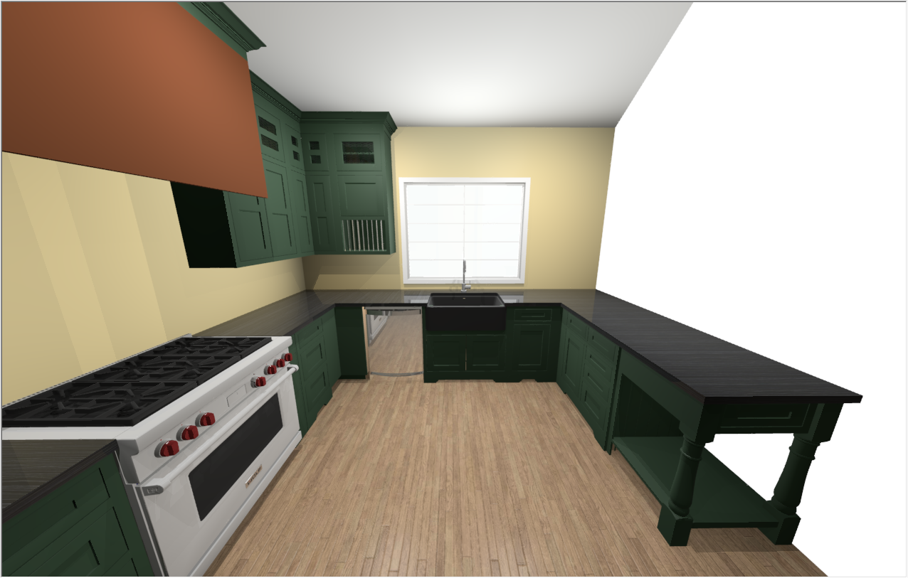 distressed basil green inset cabinets with dark brown glazing in early american colonial style with exposed barrel hinges mustard yellow vent hood