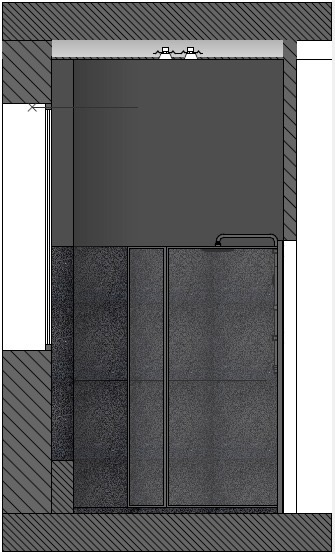 give me a realistic rendering of this shower with mate black sanitary smocked glass and black tiles