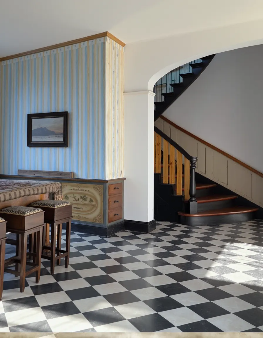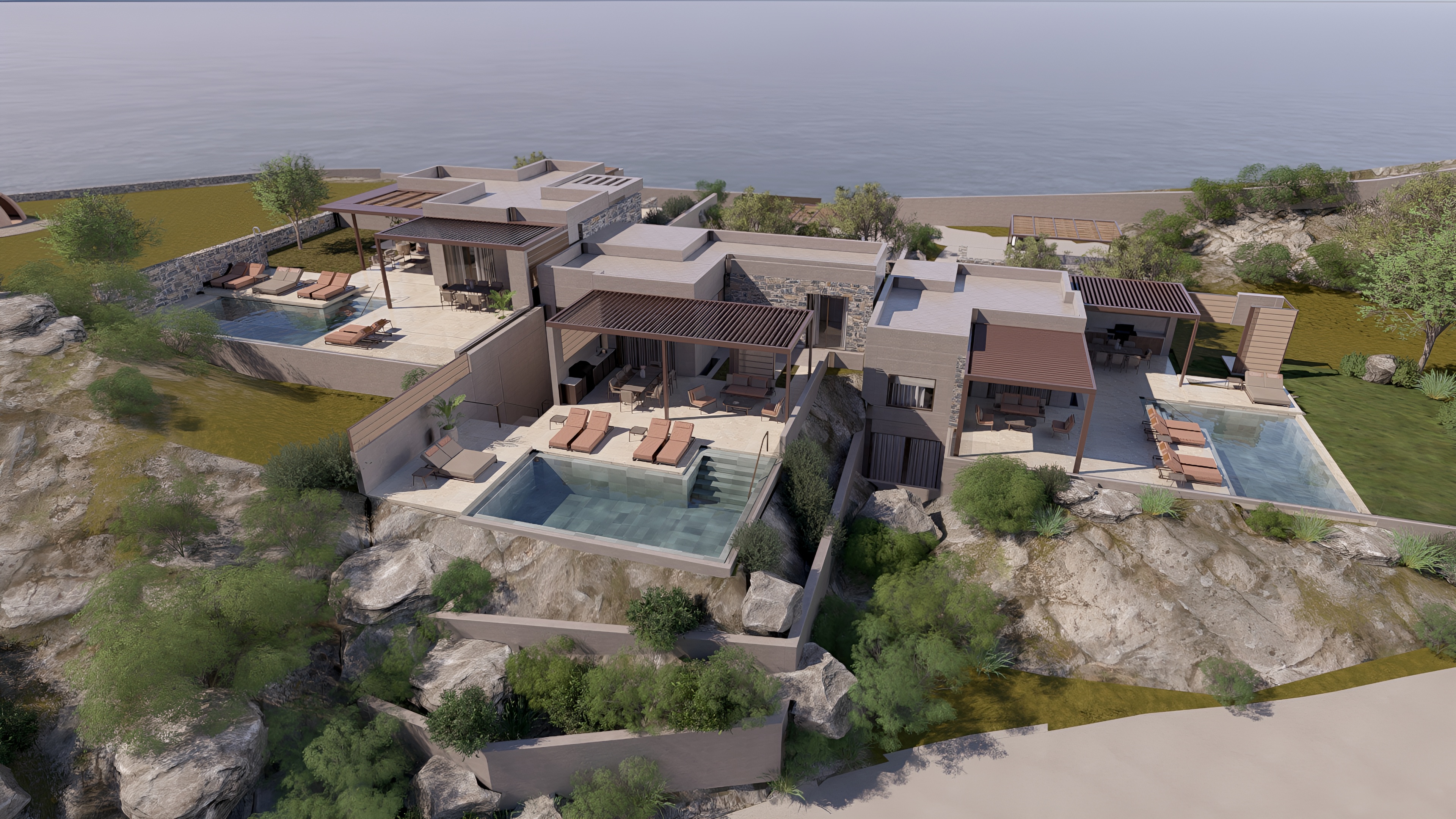 a hyper realistic image of 3 villas with swimming pools golden hour on the backgrounf you can see the sea and the horizon