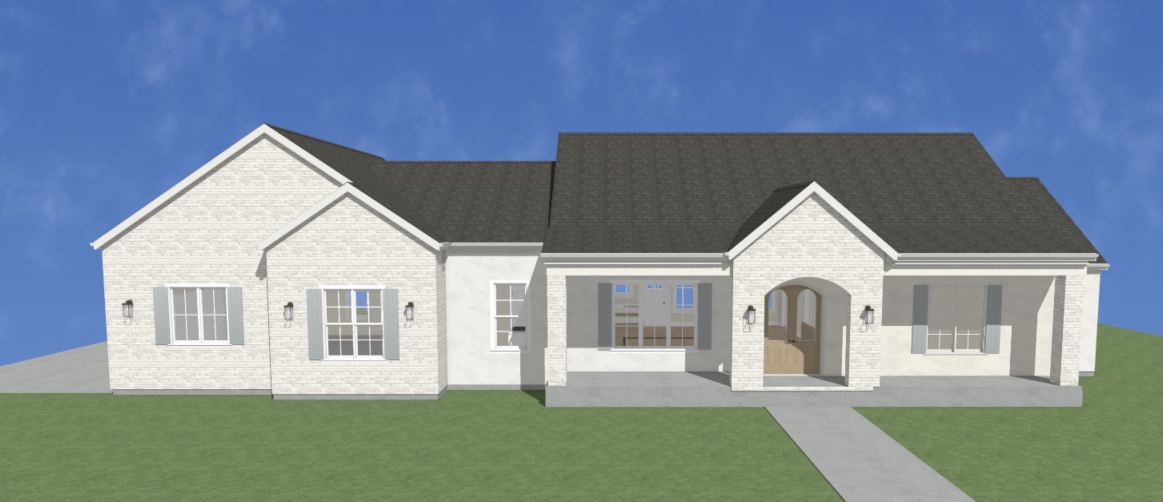 a french country style manor with dark bronw shingles white brick and white stucco gray blue shutters a light brown front door a manicured lawn with pine trees scattered behind mountains behind the trees a few native plants in the landscaping concrete front porch