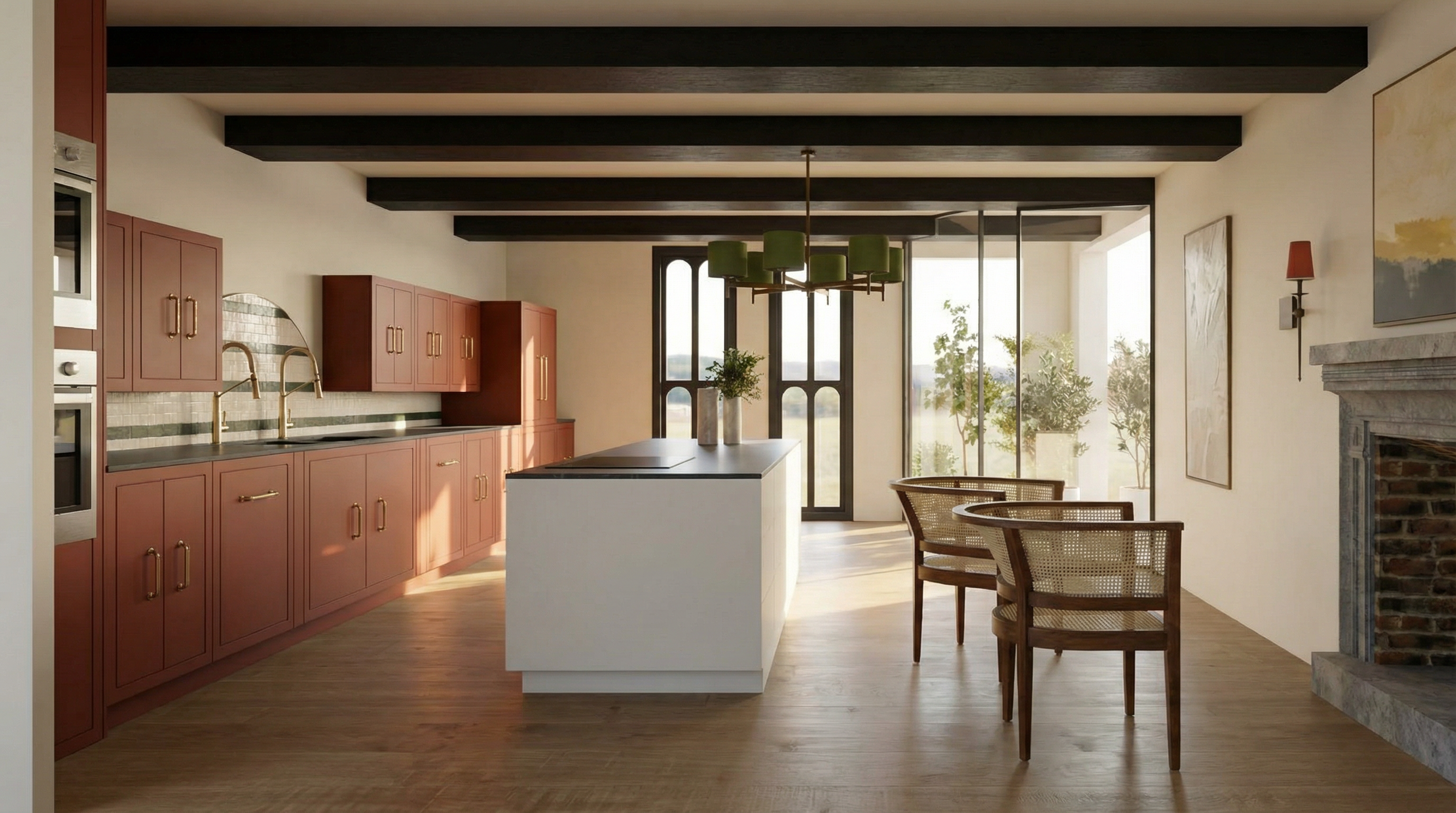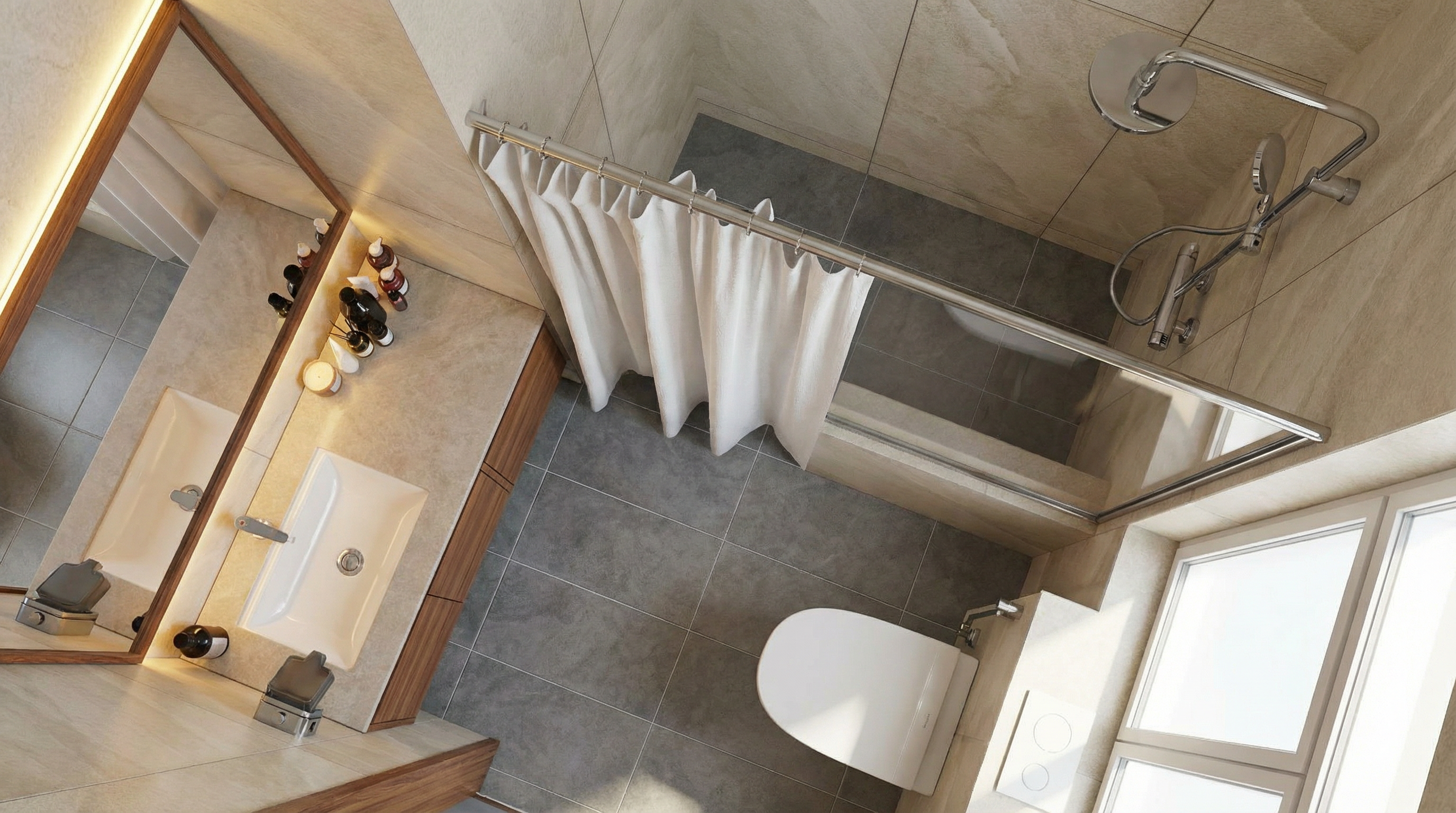 keep everything the same as is geometry wise and material wise only change the following the left wall remove the mirror and keep going up with the beige wall the wall on the right above the shelf i want a mirror