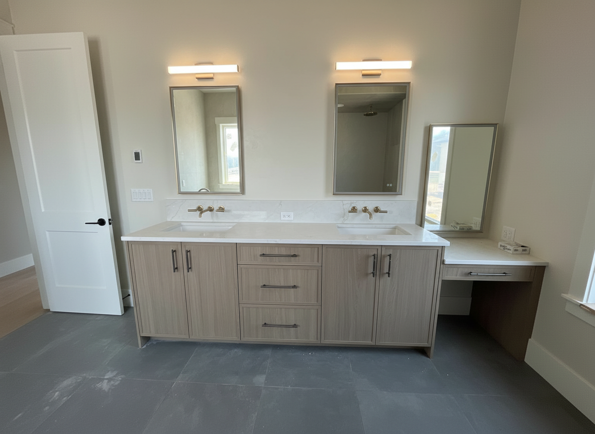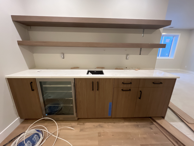 remove the blue tape finish the rest of the flooring remove the cords add a faucet to the sink and stage the shelves and countertop for a bar