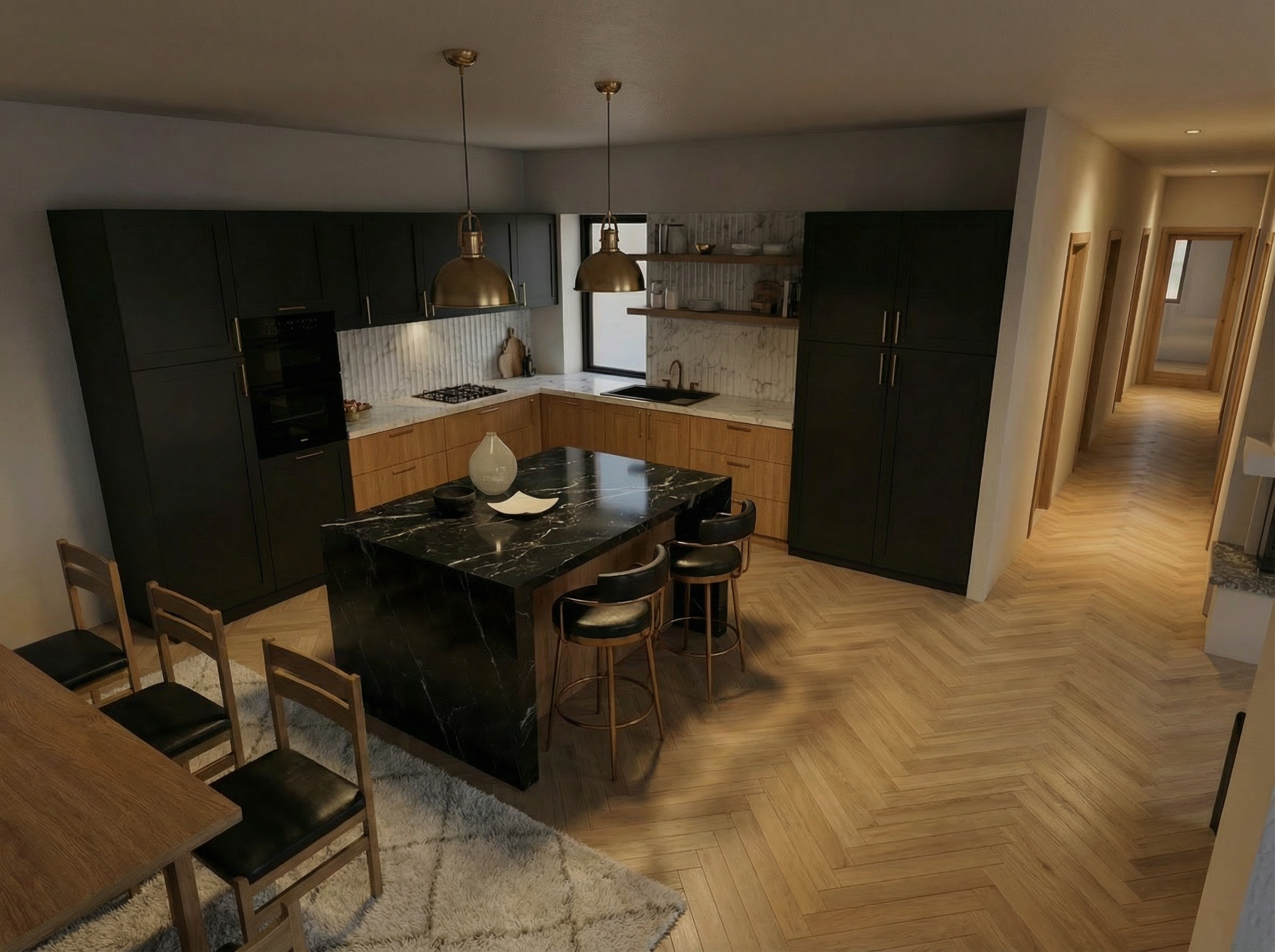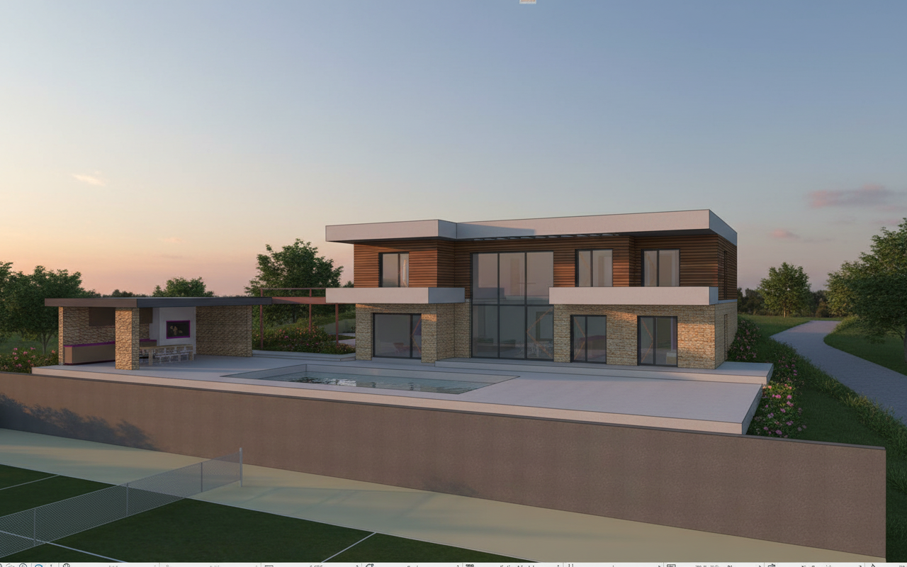 add a lot of pine trees and oak trees it s in a forest in the south of france there is a slender oak tree crossing the terrace on the left of the terrasse add a slender oak tree crossing the middle of the terrace there is a oak tree is in the middle left of the wood terrace the terrace in the background is in portuguese cobblestones oak trees are a bit sinuous the tree in the foreground is at the left of the little stairs