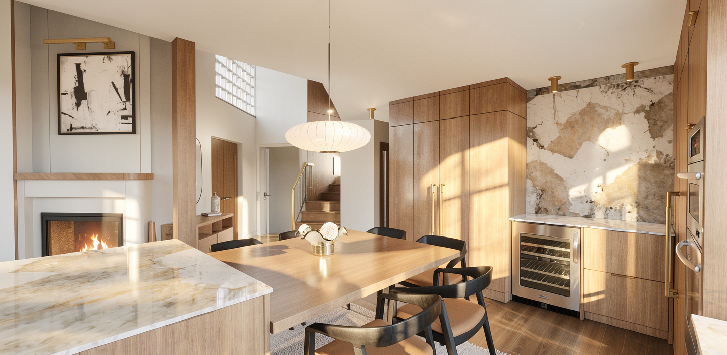 create a photorealistic rendering add midtown new york views from the 43rd floor keep all the elements proportions and finishes as they are add books and one plant on the shelves turn on two linear lights in the ceiling