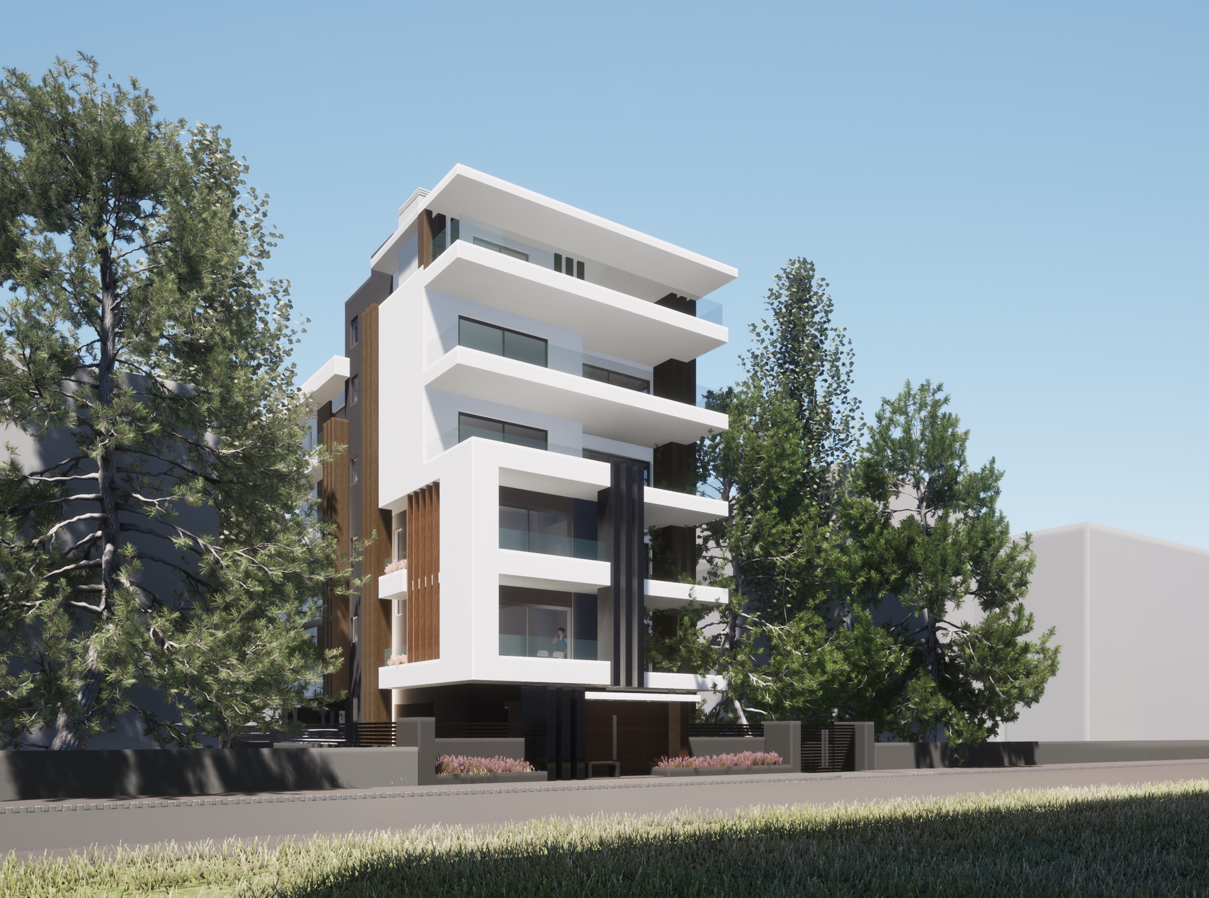 exterior shot a modern five story apartment building with a sleek design featuring wooden accents on the fa ade the building has large white balconies and tall vertical slats adding depth set against a vibrant blue sky with fluffy white clouds surrounded by lush green trees on both sides a glossy black car is parked on the smooth gray road with a couple walking leisurely nearby the atmosphere is serene and inviting capturing a sunny day
