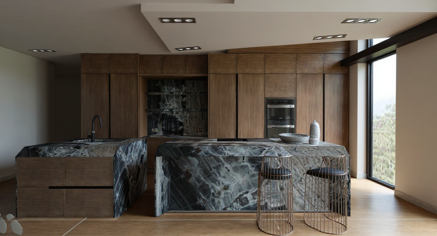 render a luxurious modern kitchen with steel metal anthracite cabinetry and countertops featuring a striking blue and white da vinci marble pattern accentuate the space with a polished black faucet on the island introduce subtle stainless steel appliances creating a harmonious contrast with the surrounding elements incorporate minimalist bar stools with black cushions and metal frames for an elegant touch the overall atmosphere should be bright and elegant with soft natural light flowing through large windows enhancing the sophisticated ambiance