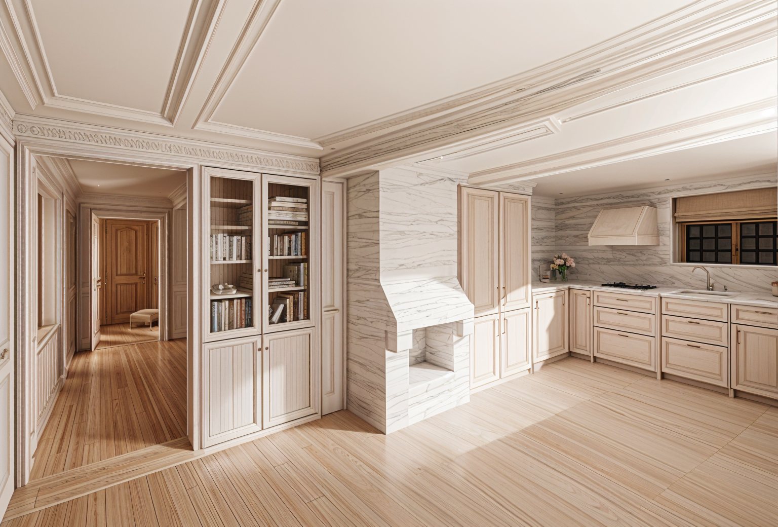 exterior shot a modern sunlit kitchen with a cozy atmosphere cabinets in soft ivory with brushed nickel handles shelves adorned with ceramic jars in muted pastel hues countertop is a light marble with subtle grey veining gas stove in stainless steel with black cast iron grates large windows framed in white allowing a flood of warm golden sunlight wood flooring in a light oak finish soft shadows creating a serene and inviting ambiance