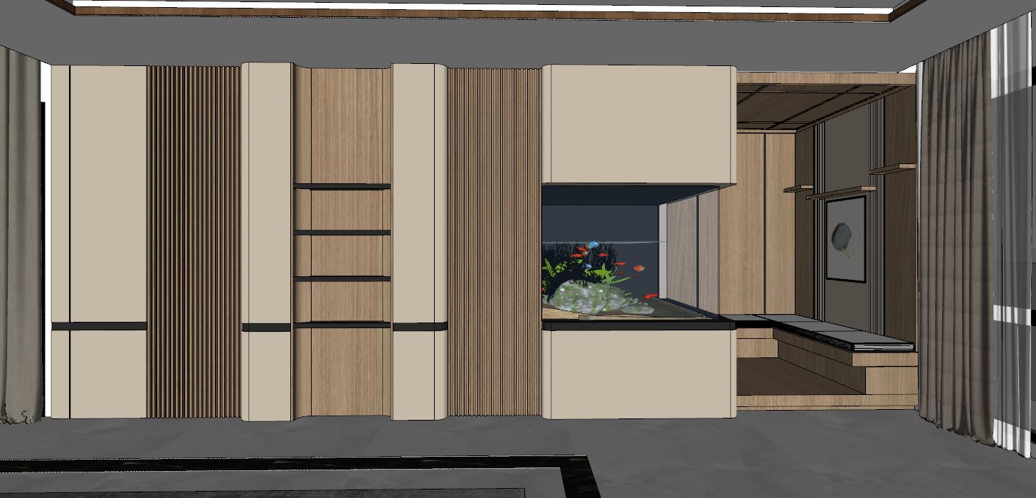 create an ultra realistic image without changing any of the structure shape design or materials don t resize the jpeg use a glossy light beige marble texture for the floor don t change the color material or shape add indirect light to the drop ceiling and add some spot lights use the glossy cream marble for the floor add blue light to the aquarium use grey fabric for bench