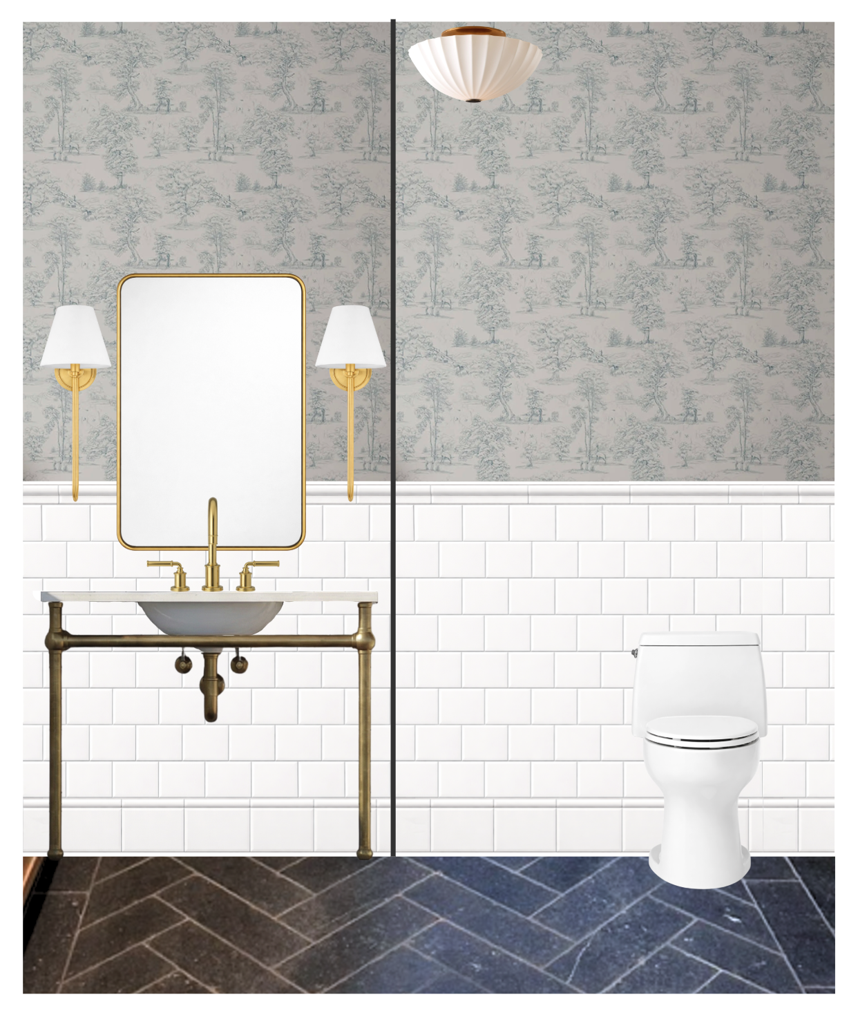 ada restroom with unlacquered brass fixtures including ada grab bars