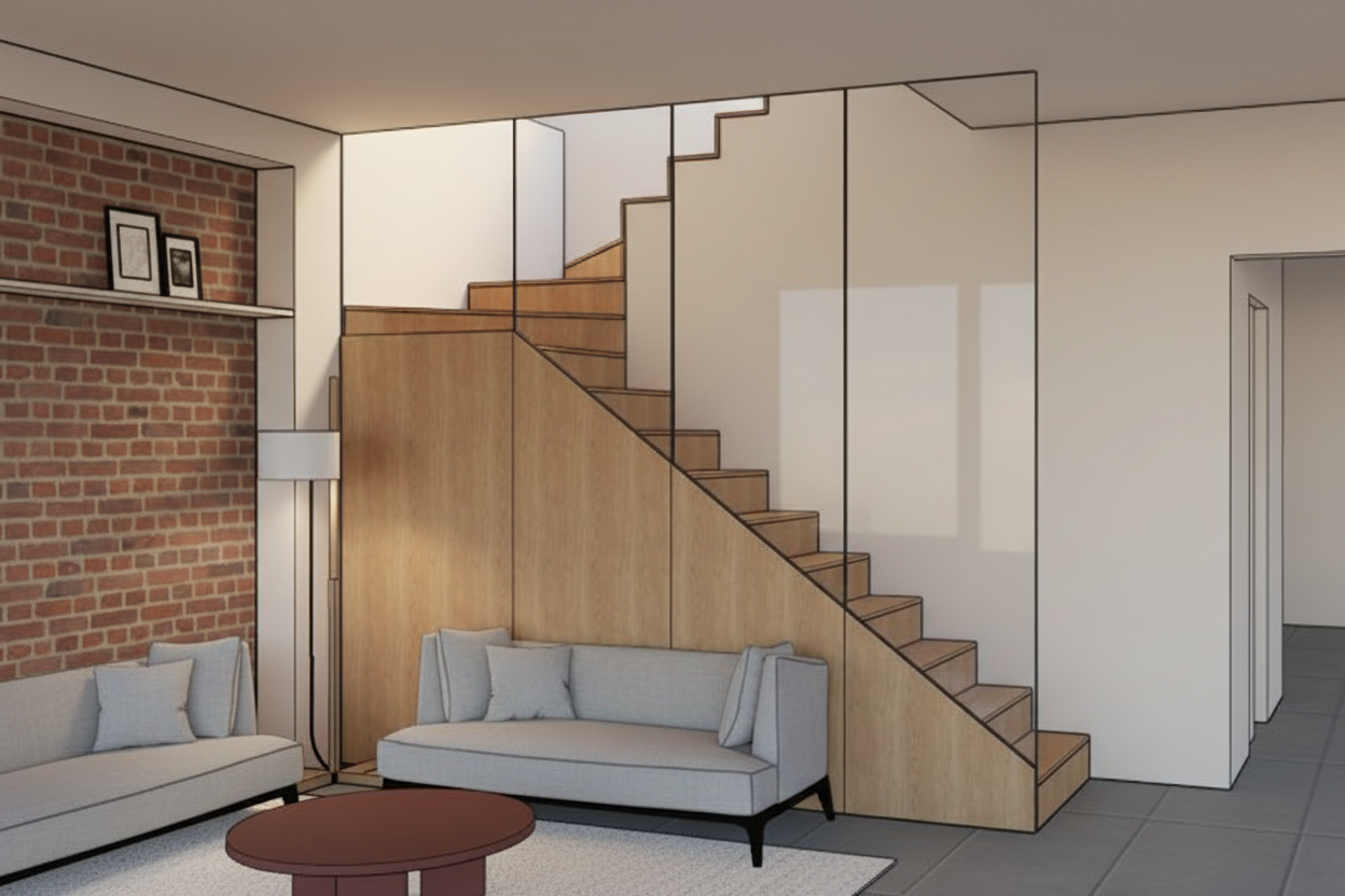 nordic interior shot render a modern living room interior with a sleek staircase feature light oak wood for the staircase and wall panels use a soft warm white for the walls design the sofas in a light gray linen like fabric with black legs and arrange the sofa pillows in a natural relaxed way add a white rug under the seating area choose a cool gray for the floor tiles and incorporate a minimalist shelf with black frames on the wall set the ceiling to a warm white do not add any extra frames or shelves on the brick wall beyond what is shown in the picture the staircase must feature glass panels with a thin anthracite gray frame subtle and minimal lighting all natural light must come from the camera viewpoint direction no light should enter from the right side as there is a solid wall there use soft diffused frontal daylight with realistic global illumination add a subtle warm glow coming from the floor lamp without overpowering the scene style render in high end photorealistic quality with real world materials no sketch look no sketch look no outlines no edge detection and no toon shading preserve the camera angle but ensure a fully realistic appearance architecture